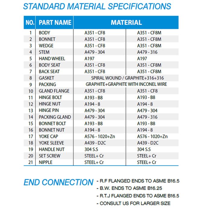 Depending on service conditions, various materials are available optionally for flange gasket and stem packing.