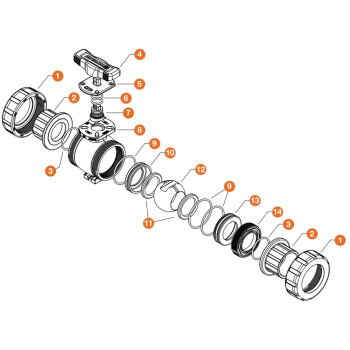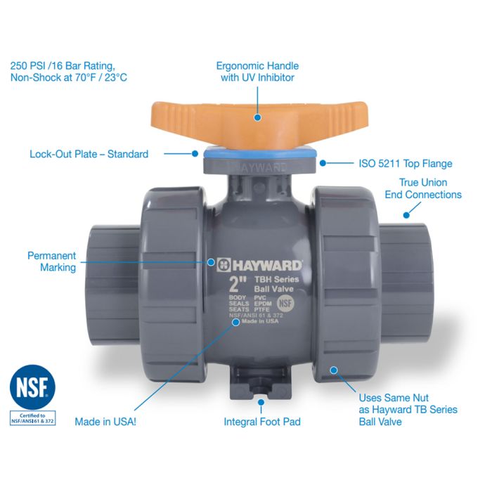 The TBH Series features a low maintenance design with its new patent pending System2™ Sealing Technology for sizes up to 2”/DN50. Sizes 2-1/2” through 6” feature have energized PTFE seats with backing O-ring as standard. All seats are reversible to allow easy field rebuild. Assisting users in protecting property and life, a standard integral lock-out feature secures onto the body of the valve. Actuator ready design with ISO 5211 pattern – on all sizes. Available in sizes 1/4˝ through 6” / DN15 – DN150 in PVC and CPVC materials. The TBH Series are fully pressure rated for 250 PSI / PN16 at 70°F/23°C non-shock up to 2”/DN50. Sizes 2-1/2”/DN65 – 4”/DN100 sizes are pressure rated for 235psi at 70°F non-shock. Lastly, the TBH is available with IPS or DIN/EN and JIS socket, threaded and flanged end connections for global use.