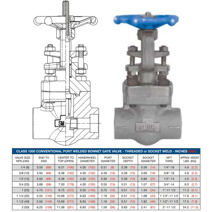 Smith Forged Gate Valves feature an outside stem and yoke (OS&Y), are available in Class 150-2500, and have conventional or full ports with either threaded, socketweld, buttweld or RF ends. All are manufactured in accordance with API 602 and ASME B16.34 standards.