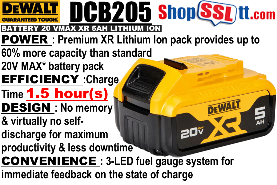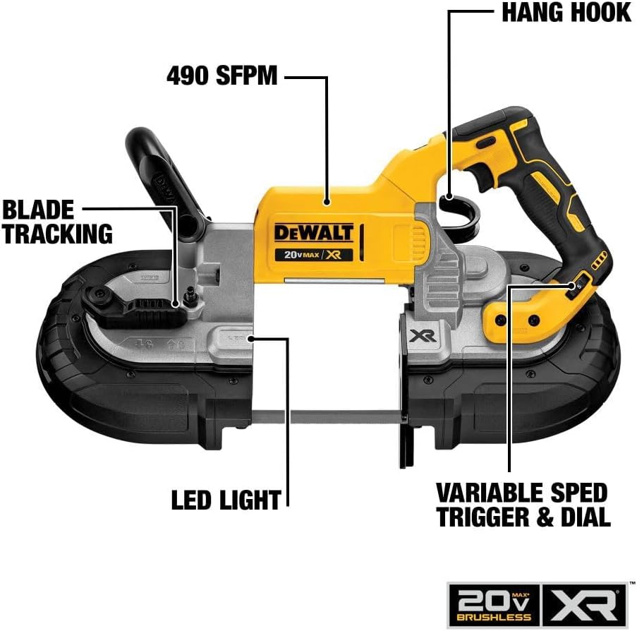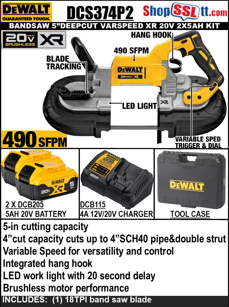 INCLUDES :(1) DCS374B 20V MAX XR Band Saw, (2) DCB205 20 V max 5.0 Ah batteries, (1) charger, (1) kit box, (1) 18TPI band saw blade.