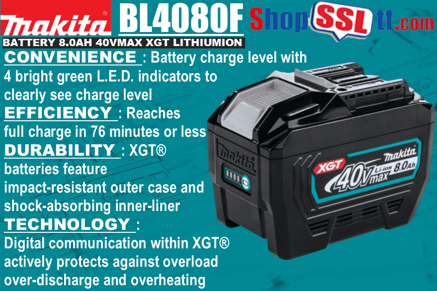 The Makita 40V max XGT® Lithium-Ion Battery charges faster and works longer, giving you and your cordless tools unmatched performance and productivity to take on the most demanding applications. The XGT® 8.0Ah Battery reaches a full charge in 76 minutes or less, so it spends more time working and less time sitting on the charger.