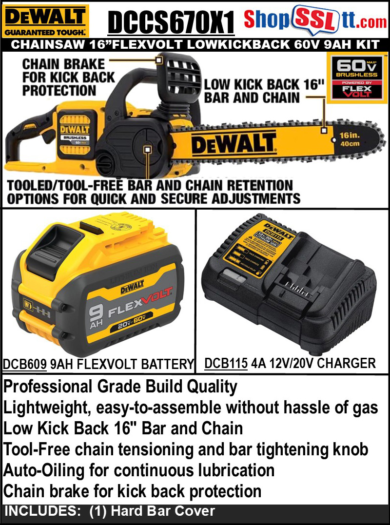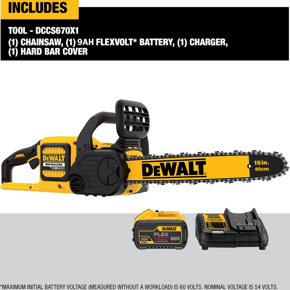 INCLUDES :(1) 20V/60V MAX* 9Ah Battery, (1) Charger, (1) Hard Bar Cover, (1) DCCS670 Brushless Chainsaw