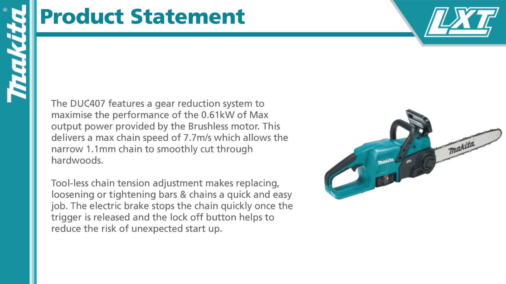 The DUC407 uses a gear reduction system to maximize the performance of the 0.61kW of Max output power provided by the Brushless motor. This delivers a max chain speed of 7.7m/s which allows the narrow 1.1mm chain to smoothly cut through hardwoods. Tool less chain tension adjustment makes replacing, loosening or tightening bars & chains a quick and easy job. The electric brake stops the chain quickly once the trigger is released and the lock off button helps to reduce the risk of unexpected start up.