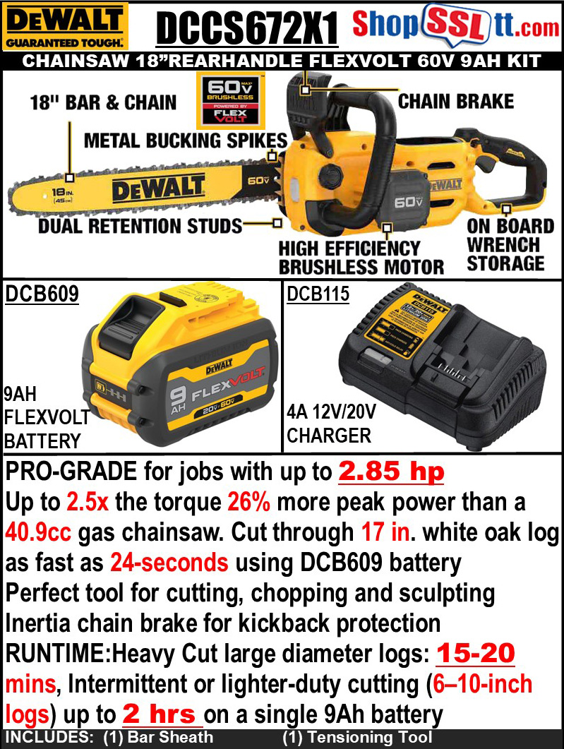 INCLUDES :DCCS672 Chainsaw, DCB609 9Ah DEWALT FLEXVOLT Battery, DCB115 Charger, Bar Sheath and Tensioning Tool