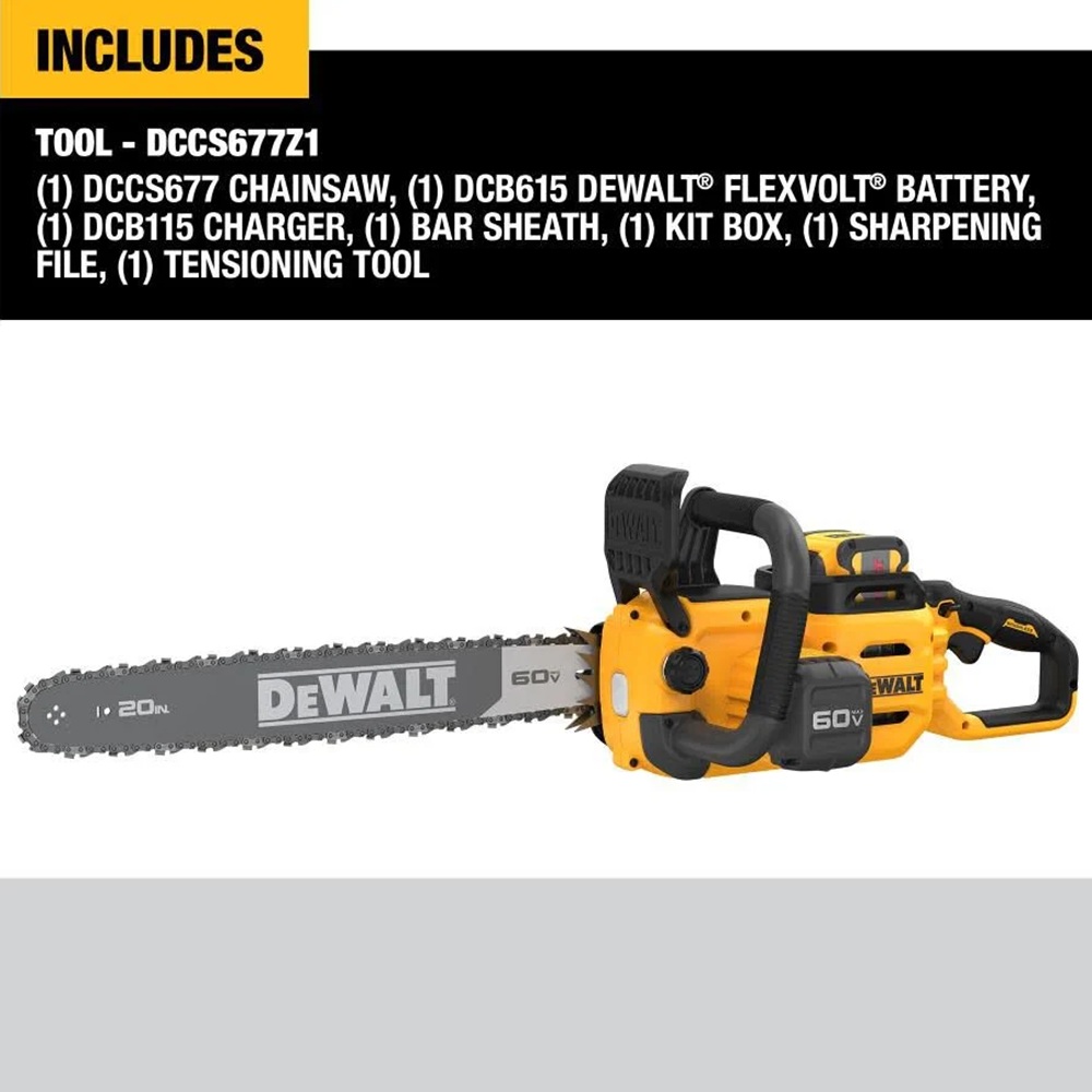 Includes DCCS677 Chainsaw, DCB615 DEWALT FLEXVOLT Battery, DCB115 Charger, Bar Sheath, Rugged Carrying Case, Sharpening File and Tensioning Tool