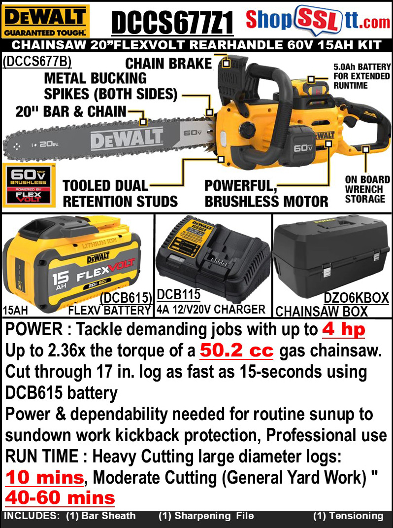 INCLUDES :DCCS677 Chainsaw, DCB615 DEWALT FLEXVOLT Battery, DCB115 Charger, Bar Sheath, Rugged Carrying Case, Sharpening File and Tensioning Tool