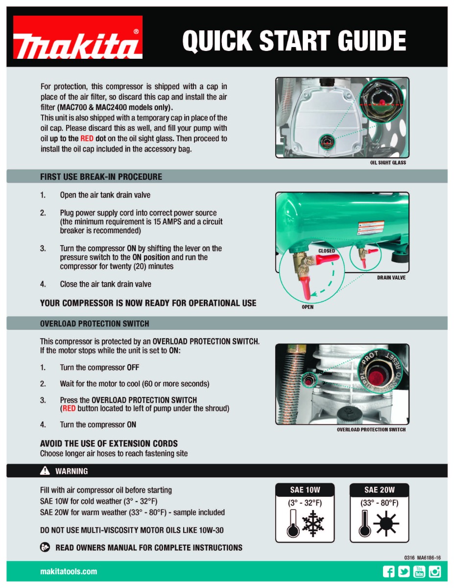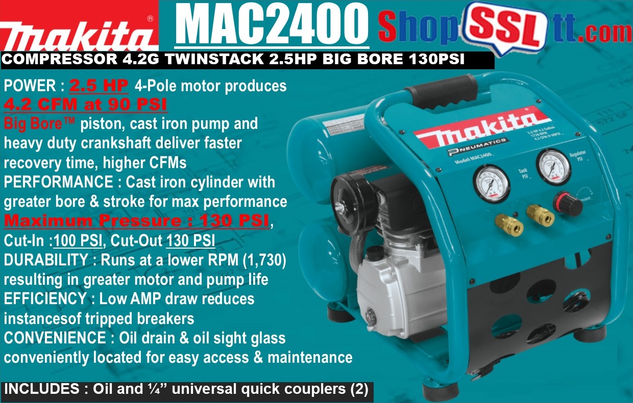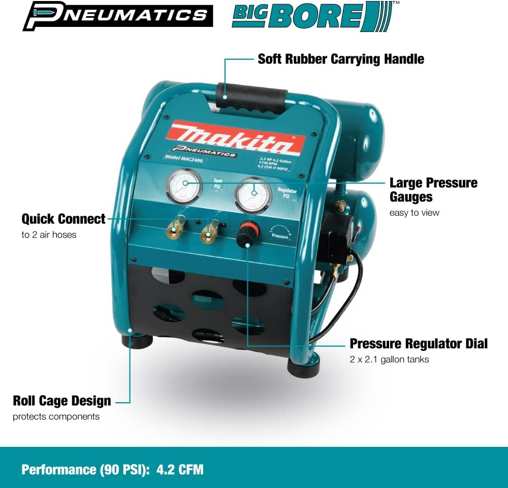 Makitaās 2.5HP Air Compressor is equipped with Makitaās Big Bore⢠engineered pump cylinder and piston for higher output for two nailers, with less noise and improved job site performance. The MAC2400 delivers industrial power and results with improved durability for tough job site conditions.