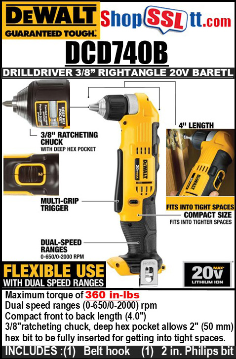 The DEWALT 20-Volt Max Lithium-Ion 3/8 in. Cordless Right Angle Drill (Tool-Only) includes a deep hex chuck so you can recess the bit further back into the head of the tool, shortening the overall front to back length of the drill with a bit inserted. Featuring dual speed ranges of 0-650 and 0-2000 RPM for increased user flexibility, this drill is ideal for tackling a wide range of applications. Easy to use and control with a multi-grip trigger for comfort and convenience, you can easily work in tighter spaces while still having access to the trigger. Durably made, sturdy and a good size and weight, use with confidence for DIY projects or on the jobsite.