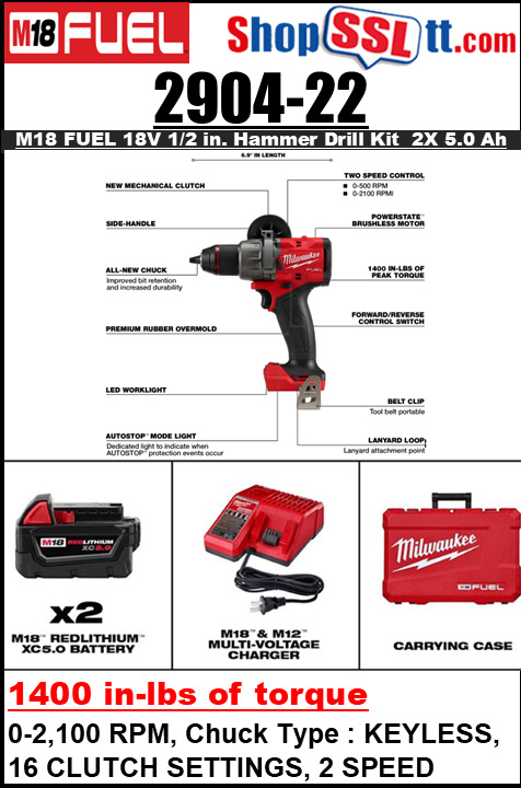Our M18 FUEL™ ½” Hammer Drill Driver is the Industry's Most Powerful Hammer Drill, delivering the capability to drill the largest holes at high speed into the densest materials. Our cordless drill is the Most Compact solution in its class and features AutoStop™ Control Mode for Enhanced Safety. The POWERSTATE™ Brushless motor delivers the most power under load to complete 2-9/16" Self-Feed holes in dense woods for increased productivity. At only 6.9” in length, this is the most compact cordless drill in its class for the best access and maneuverability in tight spaces. The AutoStop™ Control Mode offers enhanced safety for the operator by preventing over-rotation in a bind-up with the best reaction time in the industry. The REDLINK PLUS™ intelligence ensures maximum performance and protects from overloads, heating, and over-discharge. Our REDLITHIUM XC5.0™ Battery Pack delivers more work per charge and more work over the life of the pack when compared to competitors. The all metal ratcheting chuck is the best-in-class. This provides increased grip strength, durability, and corrosion resistance.