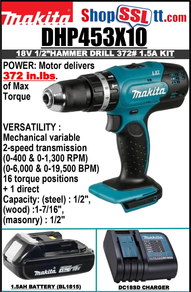 The MAKITA DHP453SX10 Cordless Hammer Driver Drill is a versatile and powerful tool for any DIY enthusiast or professional. With a 13mm (1/2") chuck and a maximum torque of 42 N·m (372 in.lbs.), it is capable of drilling through various materials with ease. The 18V LXT® Li-Ion battery provides long-lasting power, while the hammer function allows for drilling into masonry and concrete. The drill also features a compact and ergonomic design, making it comfortable to use for extended periods of time. The kit includes the drill, 1 battery and charger, providing everything you need for your drilling tasks.