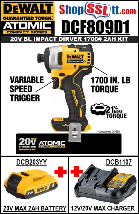 (1) DCF809D1 ATOMIC™ 20V MAX* Brushless Cordless 1/4 in. Compact Impact Driver Ki