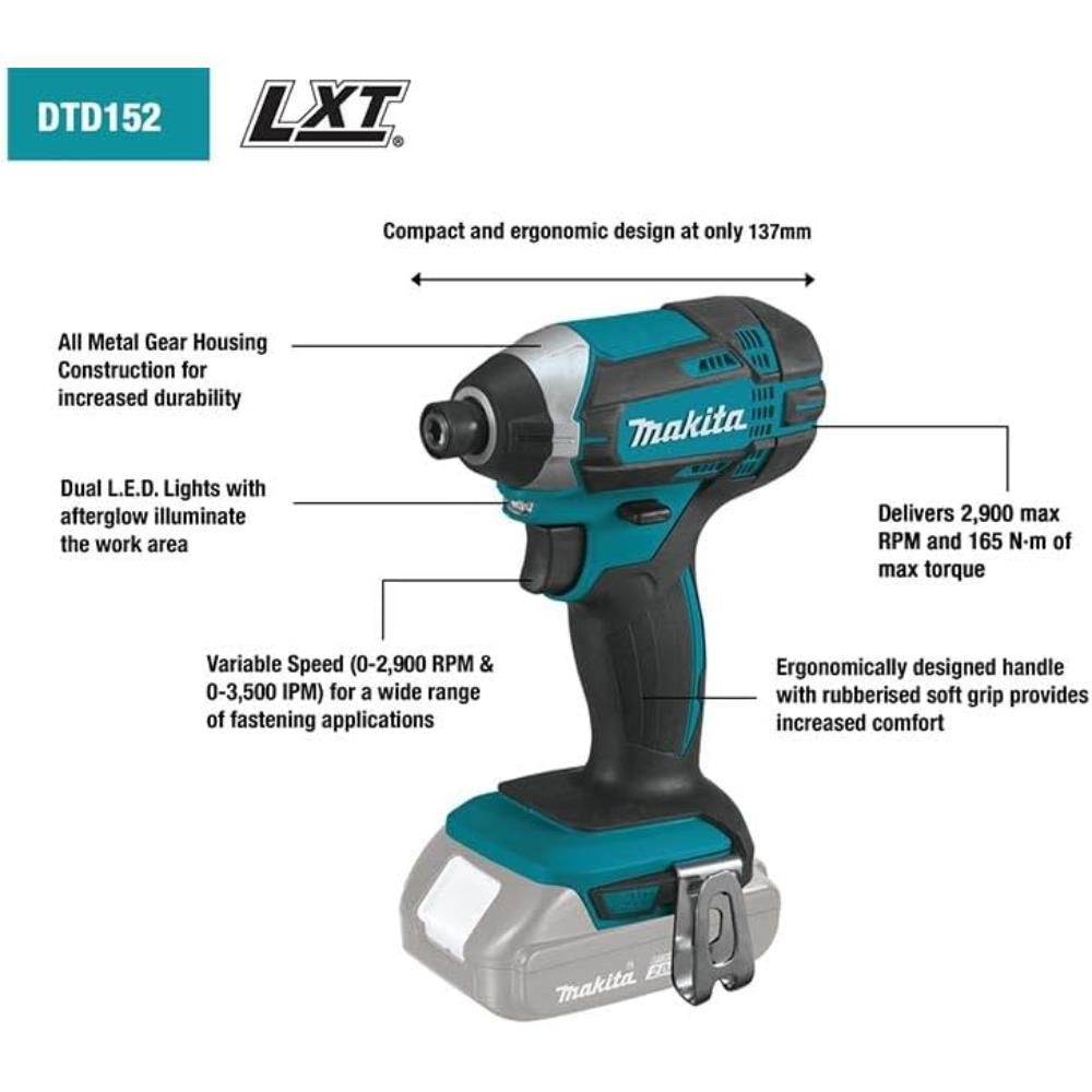 The DTD152 features a Makita-built 4-pole motor with variable speed (0-2,900 RPM and 0-3,500 IPM) that delivers 1,460 in.lbs. of Max Torque. At only 5-3/8 long and 3.3 pounds (with battery), it has a compact and ergonomic design with less weight for reduced operator fatigue, and a rubberized soft grip for increased comfort on the job. The built-in LE.D. light illuminates the job area for applications in dark spaces and close quarters.