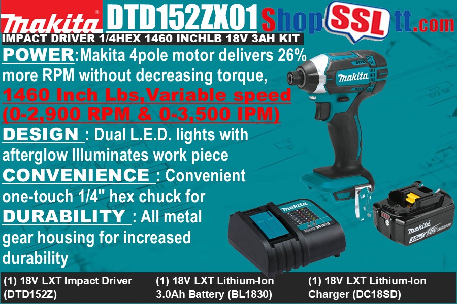 The Makita 18V LXT Lithium-Ion Cordless Impact Driver (model DTD152) delivers power and speed in a compact size for a full range of driving and fastening tasks, with a fast-charging 18V Lithium-Ion battery for less downtime.