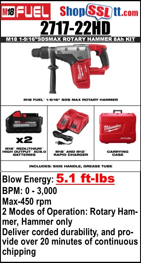 INCLUDES: (1) M18 FUEL™ 1-9/16" SDS Max Rotary Hammer(2717-20), (2) M18™ REDLITHIUM™ HIGH OUTPUT™ XC8.0 Battery(48-11-1880), (1) M18™ & M12™ Multi-Voltage Charger(48-59-1812)
