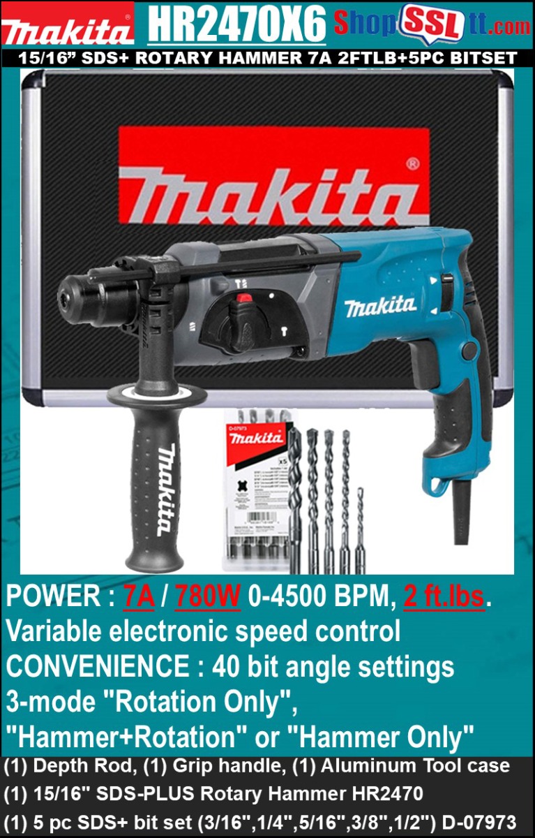 The Makita HR2470X6 is a robust 24mm (15/16") combination rotary hammer drill featuring a powerful 780W motor delivering 2.4J of impact energy. It offers three operational modes: "Rotation Only", "Hammering with Rotation", and "Hammering Only", making it suitable for various drilling and chiseling applications. Designed for durability and ease of use, it includes features like an ergonomic pistol-shaped handle with a soft grip, one-touch sliding chuck for quick bit changes, and a depth gauge for drilling consistency. The HR2470X6 is engineered with enhanced sealing and impact reduction features, ensuring reliable performance in demanding tasks. FEATURES - Powerful 780W motor delivers 2.4J of impact energy - Three-mode operation: "Rotation Only", "Hammering with Rotation", and "Hammering Only" - High durability design with improved sealing and impact reducing features - Ergonomic pistol-shaped handle with soft grip for comfort and control - One-touch sliding chuck for quick bit changes - Variable speed control for matching speed to the application - Depth gauge for increased drilling consistency - Includes grip, depth gauge and aluminum case