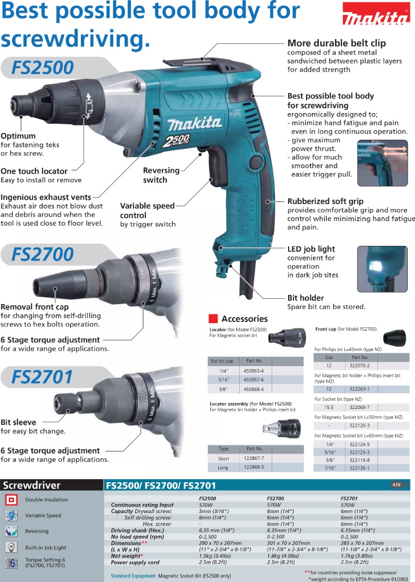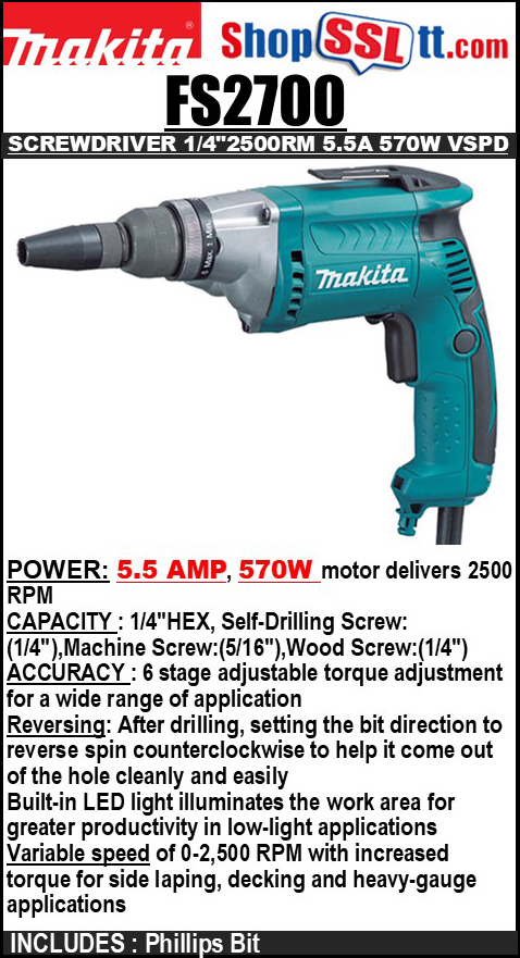 The Makita FS2700 Screwdriver with a Powerful 570 W Motor that provides 0-2,500 RPM to handle the most challenging applications. Features with design for easy handling and maneuverability and minimize hand fatigue and pain even in long continuous operation drywall screws. This screwdriver has a Steel-reinforced belt clip for user convenience and increased durability. In addition, Double Insulation protects the user, 6 Stage torque adjustment for a wide range of applications, Variable speed allows the user to control speed, and Built-in LED light illuminates the work area for greater productivity in low-light applications.