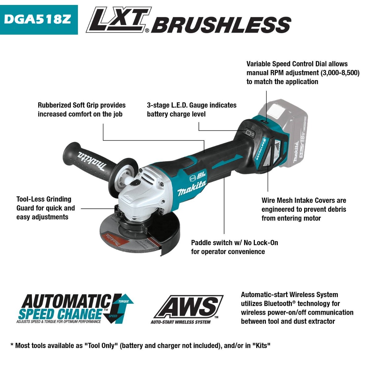 DGA518Z: 18V LXT® Brushless 5" Cut-Off/Angle Grinder (DGA518Z/ XAG21Z)