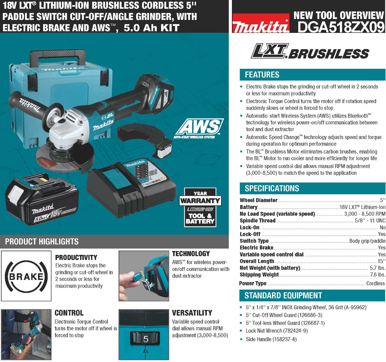 Makita delivers corded grinding performance without the cord with the 18V LXT® ithium-Ion Brushless 5” Paddle Switch Cut-Off/Angle Grinder with Electric Brake and AWS®. It's powered by a Makita brushless motor for longer run time, increased power and speed, and longer tool life. For the most demanding applications, Makita’s exclusive Automatic Speed Change™ technology automatically adjusts speed and torque during operation for optimal performance. The DGA518ZX09 / XAG21ZU is ideal for grinding and cutting a wide range of materials including tile, concrete, pipe, conduit, and more.