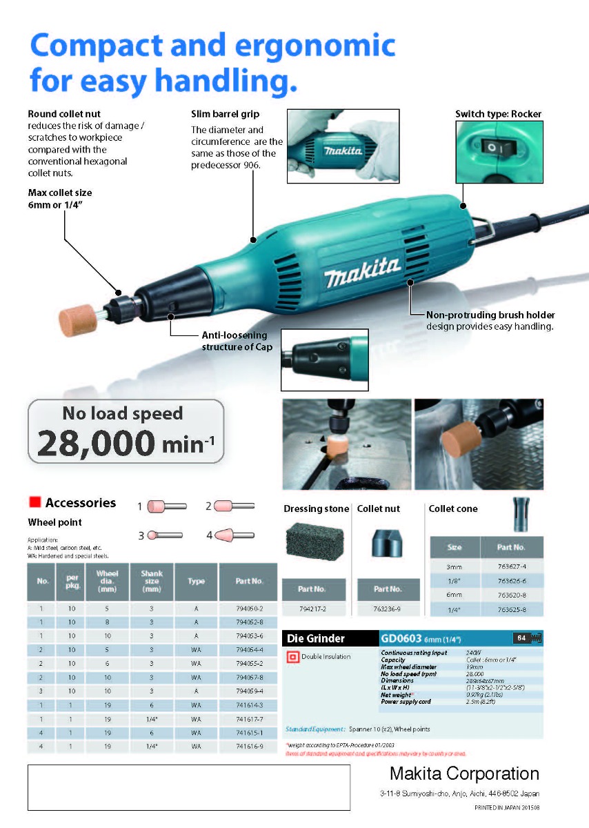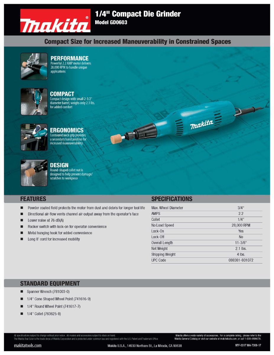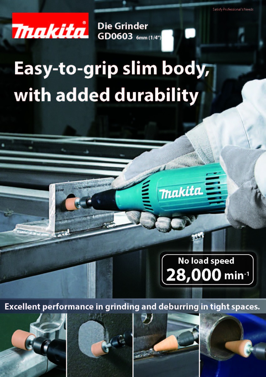 Makita’s ¼-Inch Compact Die Grinder (model GD0603) combines power and speed in a compact size, and features motor-protection features for longer tool life. It has a powerful 2.2 AMP motor with 25,000 RPM in a slim body design, and a conveniently located rocker switch with lock-on for operator convenience. Durability features include a powder-coated field that protects the motor from dust and debris for longer tool life. Convenience features include directional air-flow vents to channel air output away from the operator, a comfortable contoured neck grip, and a metal hanging hook. This combination of power, durability and ease-of-use features makes the GD0603 ideal for a range of grinding tasks including pipe fittings and small-scale grinding.