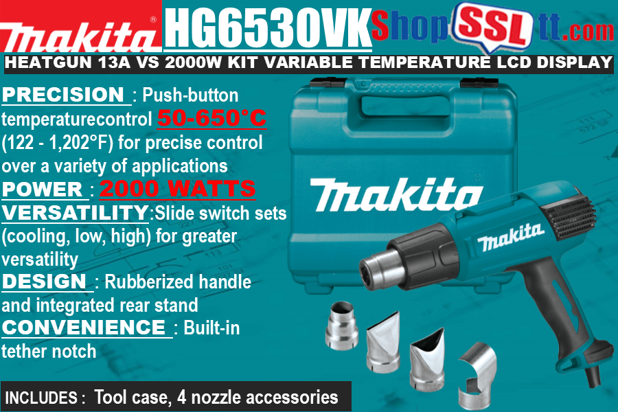 The Makita Variable Speed Heat Guns are engineered for industrial applications including vehicle wraps and tinting, stripping lacquer, paint and varnish, thawing frozen pipes, loosening tile and putty, re-melting adhesive, removing stickers, waxing and de-waxing, bending plastic pipes and sheets, and more. The HG6530VK is 2000W and features precise temperature control with a push-button temperature control (122° - 1,202° F) and slide switch for three air flow settings so the user can set the heat and blower speed to the application.