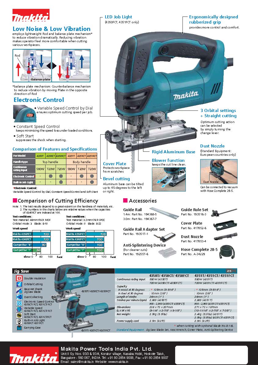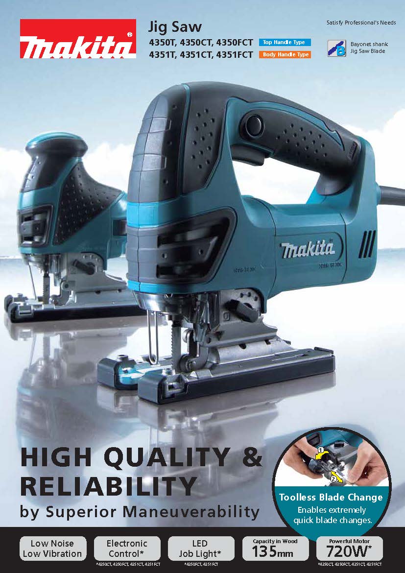 Makita’s Top Handle Jig Saw, Model 4350FCT, combines power and superior feel with substantially less vibration and noise for improved cutting performance. It is ideal for woodworkers, cabinet makers, remodelers, and general contractors seeking a best-in-class top handle jig saw.