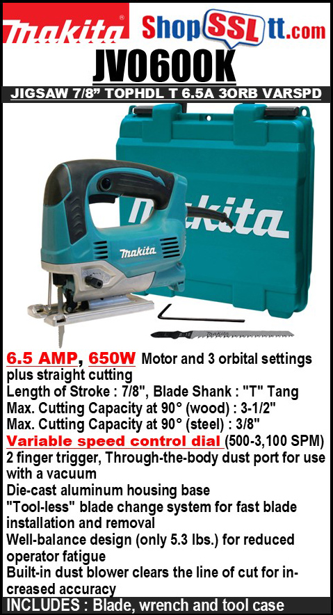 Top Handle Jig Saw; with Tool Case.POWER : 6.5 AMP Motor and 3 orbital settings plus straight cutting