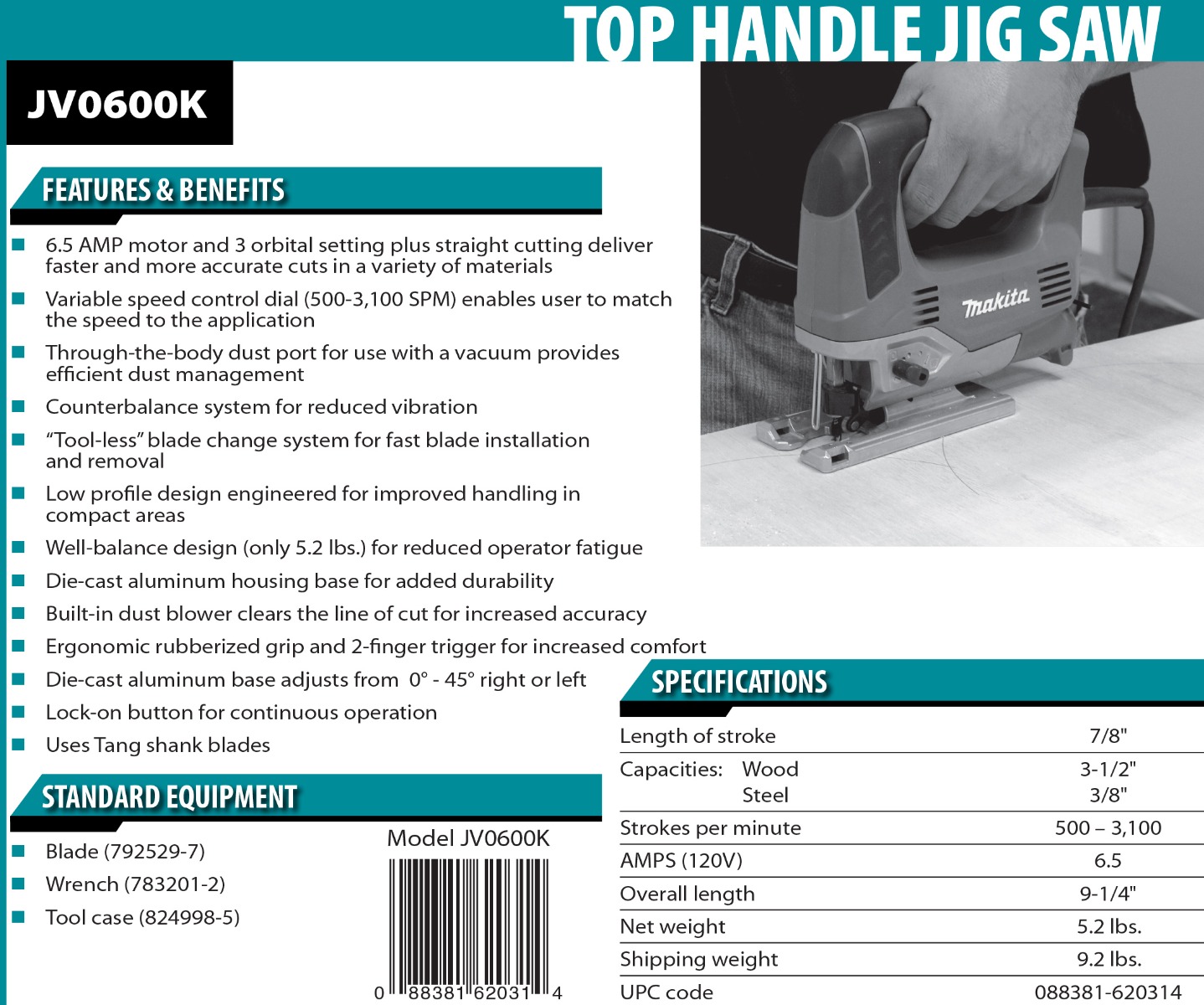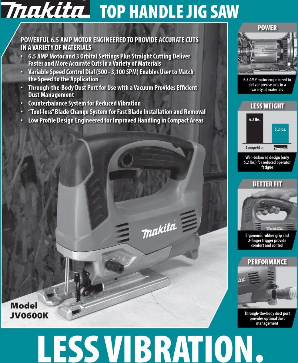The JV0600K is engineered with a powerful 6.5 AMP motor and a variable speed control dial (500 û 3;100 SPM) for optimal cutting performance in a variety of materials. The internal counterbalance system is engineered for reduced vibration and improved comfort; so the tool user gets top cutting performance with less vibration. The die-cast aluminum base adjusts from 0 degrees to 45 degrees right or left with an on-board wrench for fast bevel adjustments.