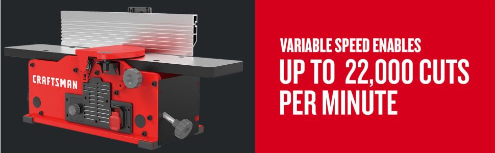 10 Amp Benchtop jointer features a variable speed range of 6, 000 to 11, 000 RPM and Cutter head speed of 12, 000 to 22, 000 cuts per minute, allowing selection correct speed for material's size and hardness. Two-knife Cutter head, with jackscrew knife leveling arrangement and built-in cutter head lock, allows for easy knife replacement and adjustment. Jointer is ideal for edging, flattening, or face jointing.