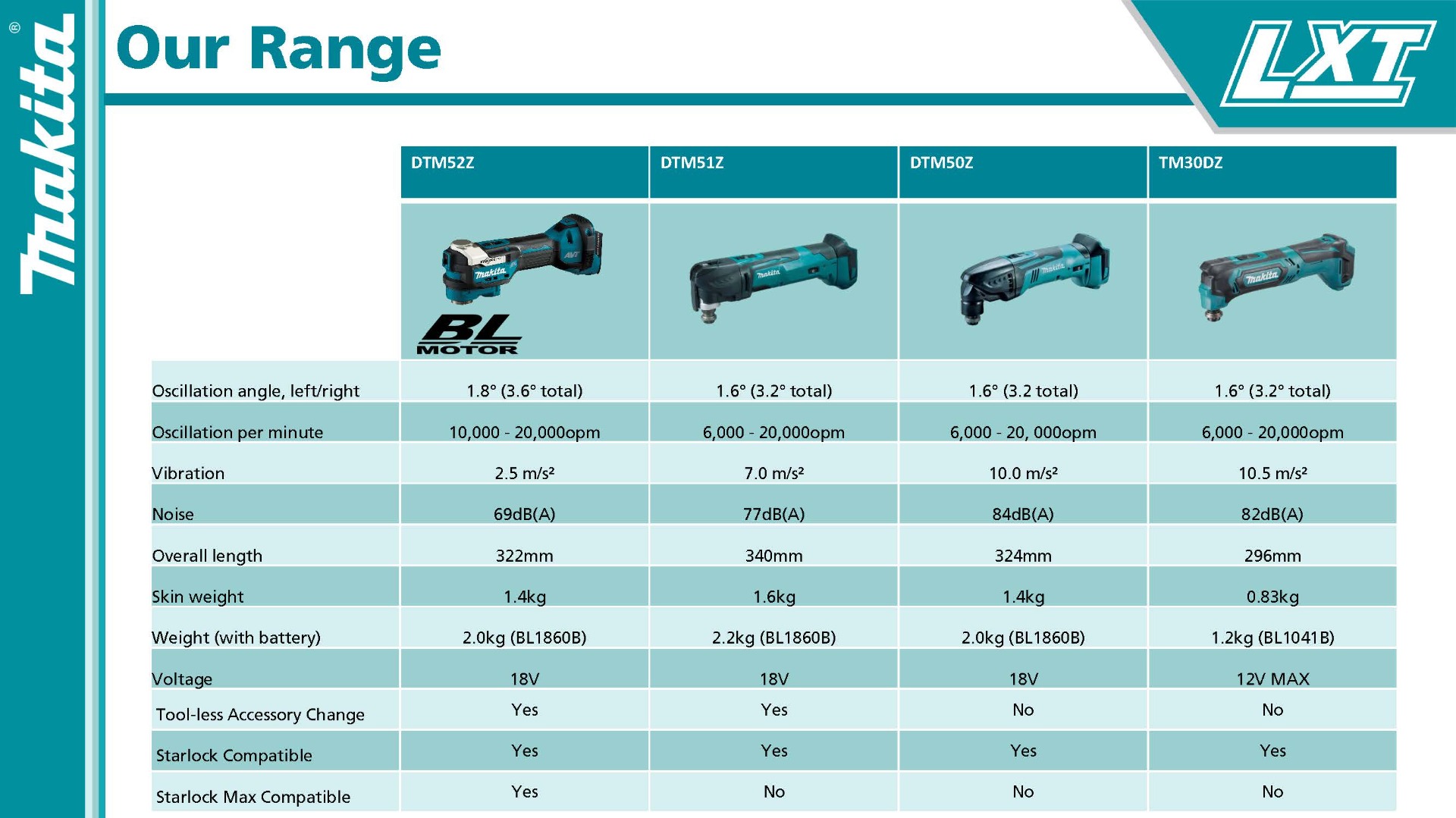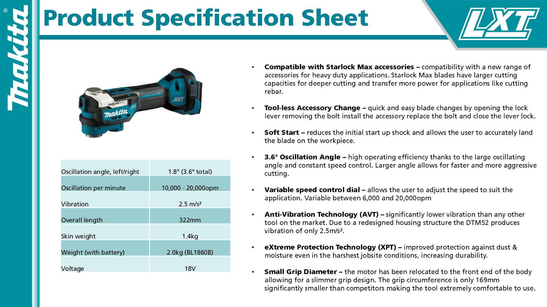 The DTM52Z features the StarlockMax® System, a tool-less clamp system for faster accessory installation. When used with Starlock® Oscillating Multi-Tool Accessories, this oscillating multi-tool is ideal for cutting, sanding, scraping, grout removal, and many more applications.