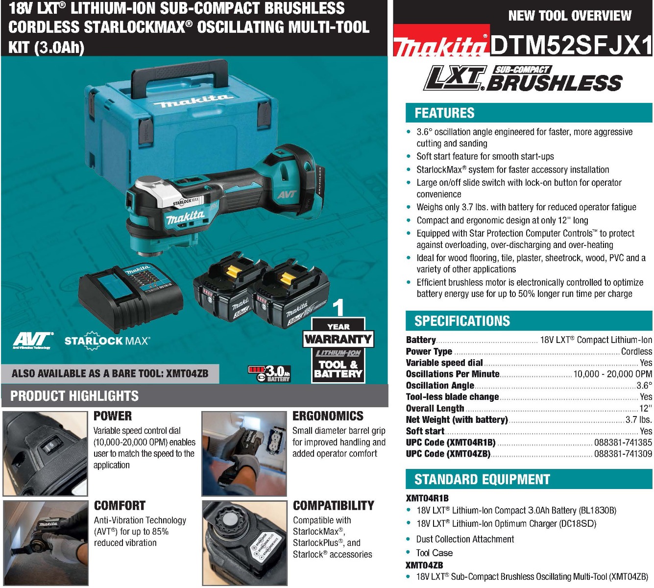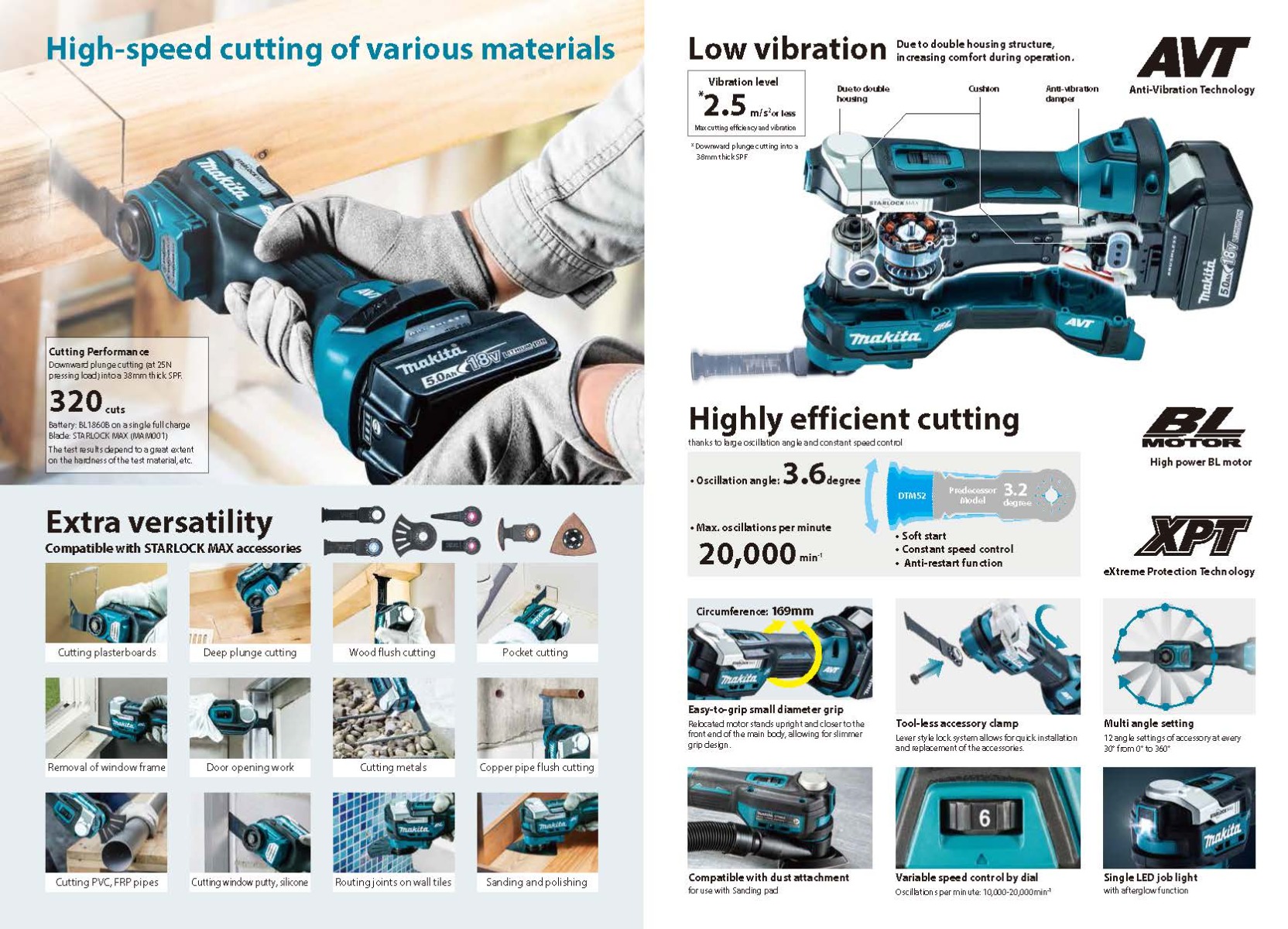 The multi-tool features variable speed control dial (10,000-20,000 OPM) with soft-start so users can match the speed to the application. It’s equipped with Anti-Vibration Technology (AVT®), an internal counterbalance system engineered to reduce vibration. It has a 3.6-degree oscillation angle for faster, more aggressive cutting and sanding. The small diameter barrel grip provides improved handling and a large on/off slide switch with lock-on button provides convenience.