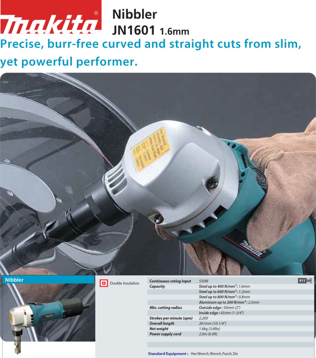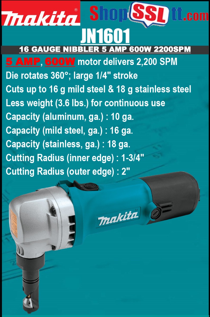 The Makita JN1601 16-Gauge Nibbler is a lightweight, corded electric sheet metal cutter engineered for clean and precise curved or straight cuts in mild steel, stainless steel, and aluminum. Its rotatable die (360°) and large 1/4″ stroke enable smooth, controlled cutting through 16 ga mild steel and 18ga stainless steel, making it ideal for deck plate, keystone plate, corrugated metal, roofing materials, and other sheet metal applications. The slim ergonomic design and built-in thickness gauge enhance handling and convenience for professional and DIY users alike.