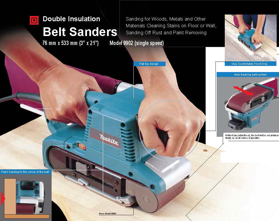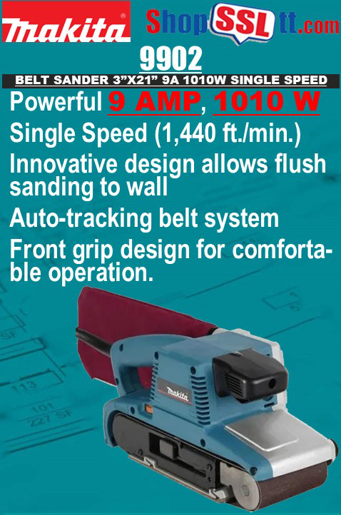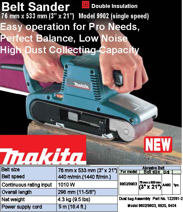 Makita’s 3 x 21-Inch Belt Sander, model 9202, combines power and speed with ease-of-use features and less noise for fast and efficient stock removal. The 202 is ideal for woodworkers, carpenters, furniture makers, floor installers, deck builders and general contractors who require a best-in-class belt sander.