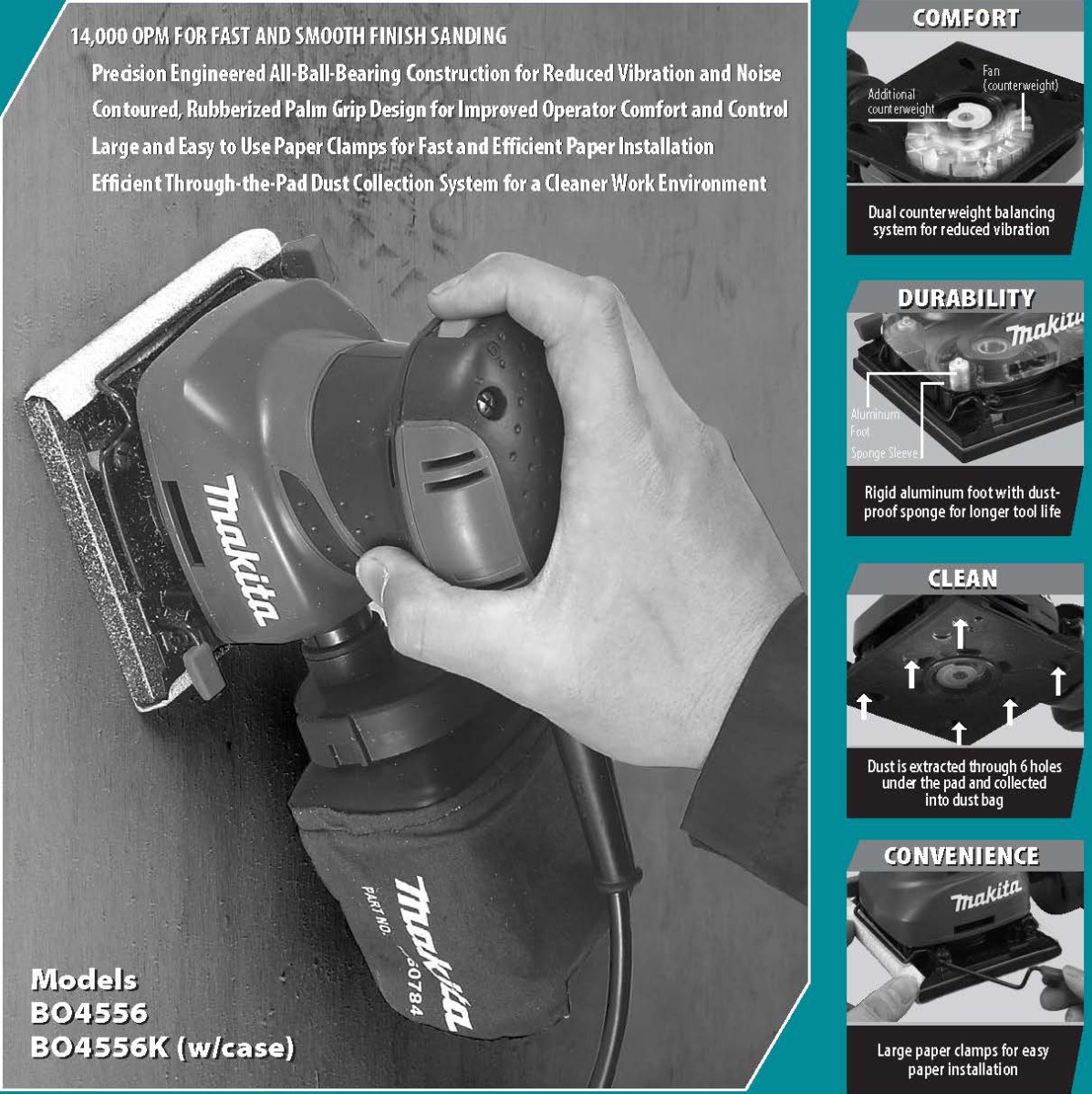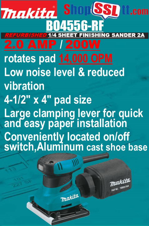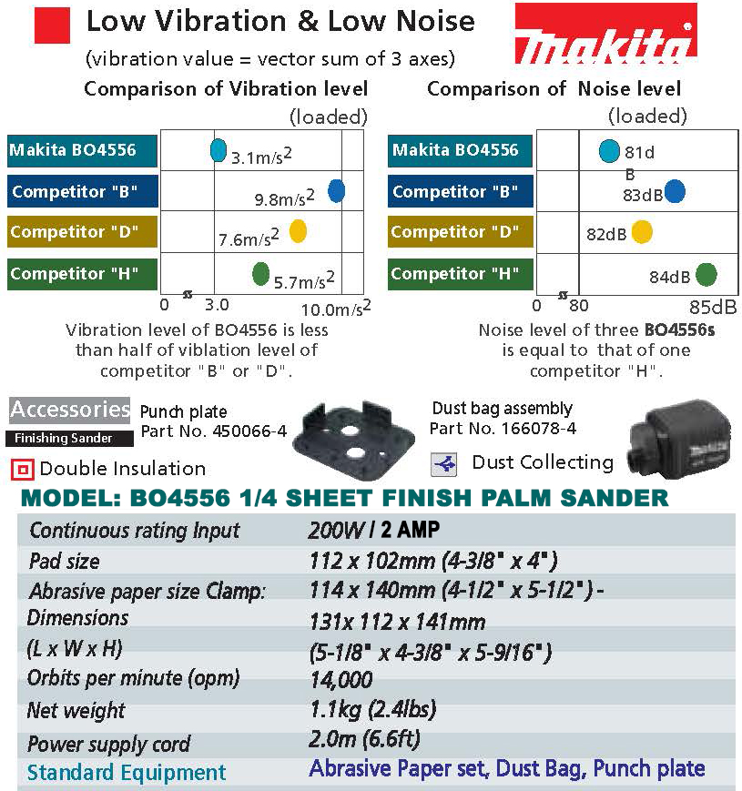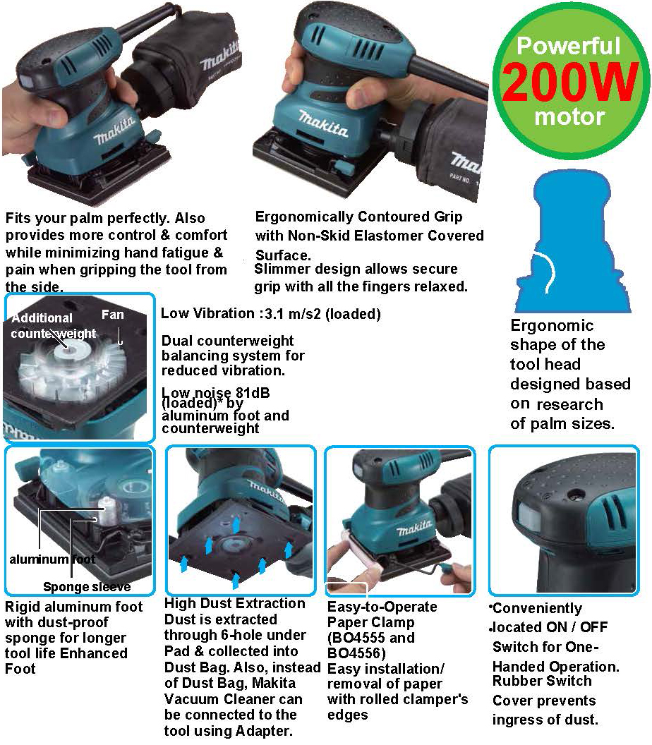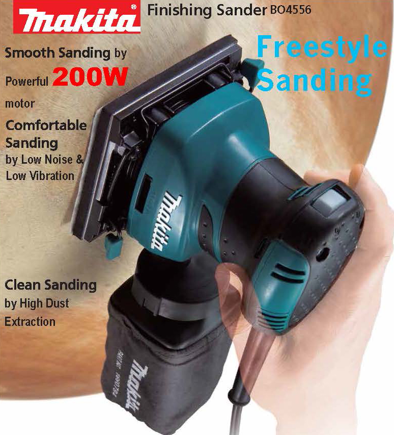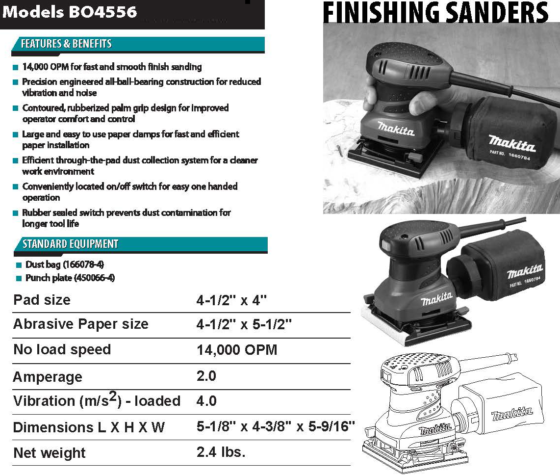 Makita’s Finishing Sander (model BO4556), combines fast, smooth performance with a contoured rubberized palm grip and ease-of-use features. The BO4556 is ideal for woodworkers and finish carpenters who require a best-in-class sander.