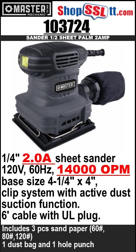 Master Mechanic 1/4" 2.0A sheet sander, 120V, 60Hz, 14000 OPM, base size 4-1/4" x 4", clip system with active dust suction function. 6' cable with UL plug. Includes 3 pcs sand paper (60#, 80#,120#), 1 dust bag and 1 hole punch