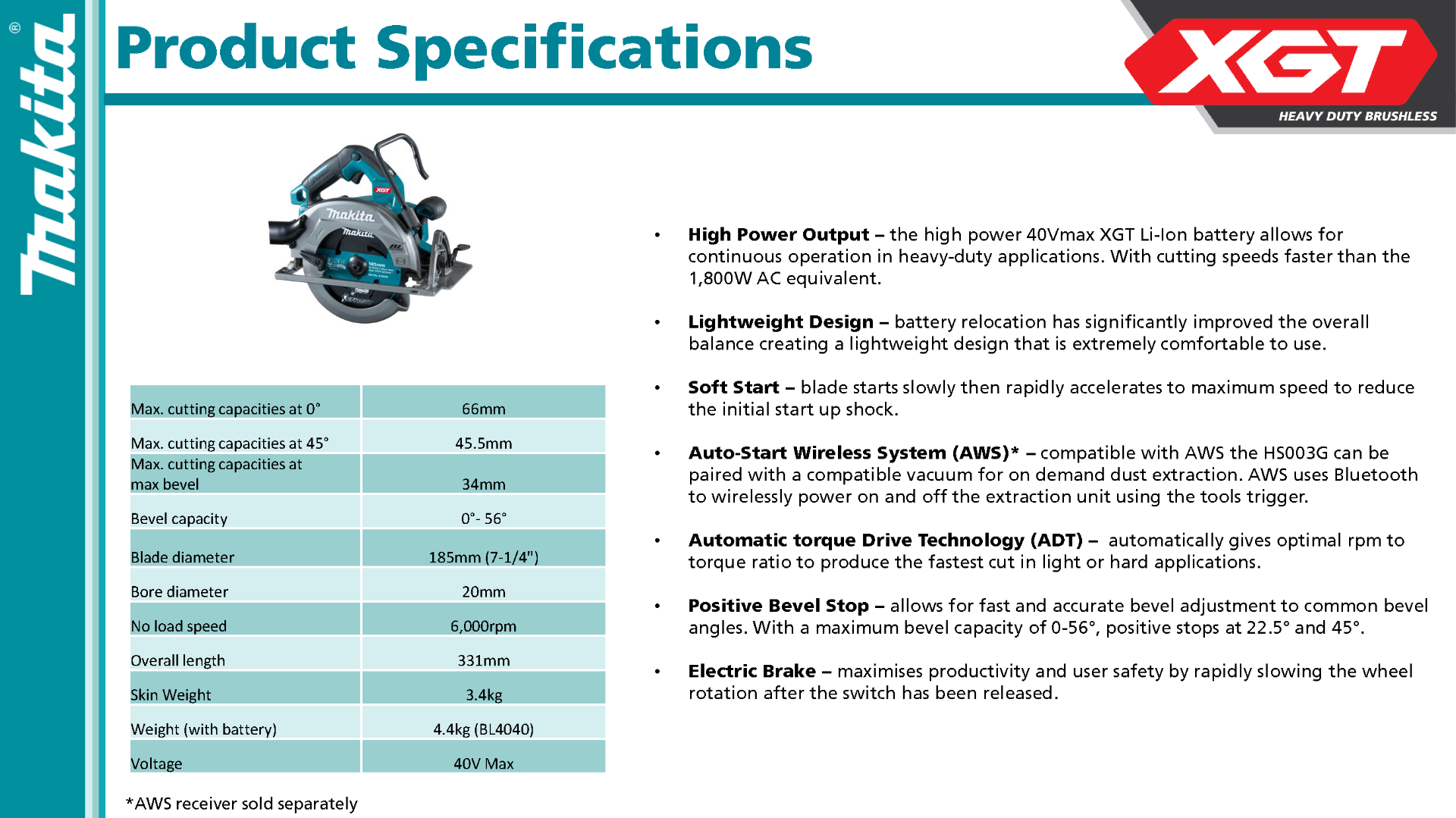 (1) 40Vmax XGT BL AWS ADT Cordless 190/185 mm (7-1/4") Magnesium Circular Saw