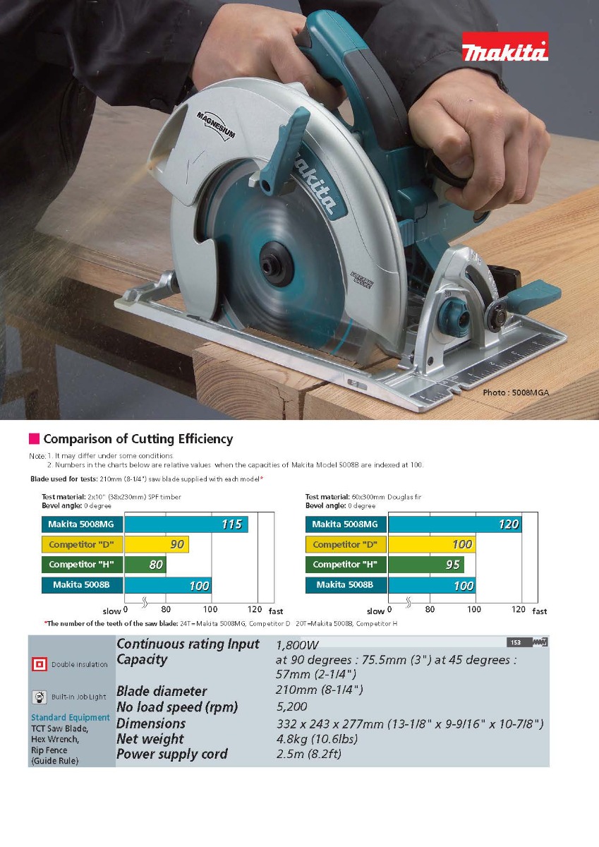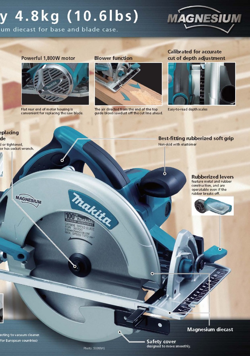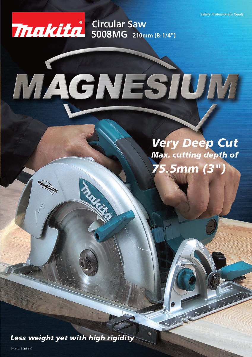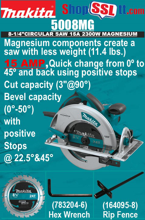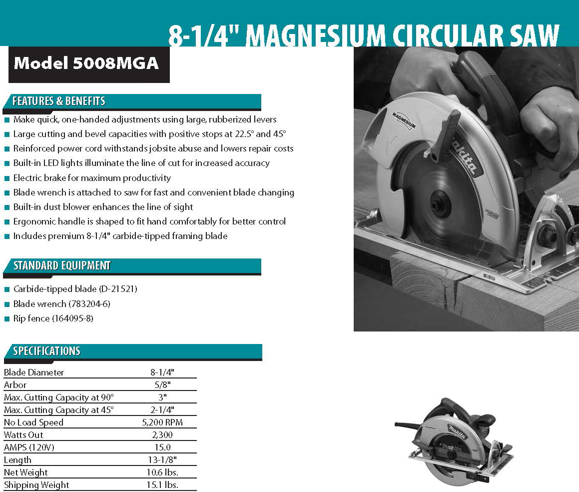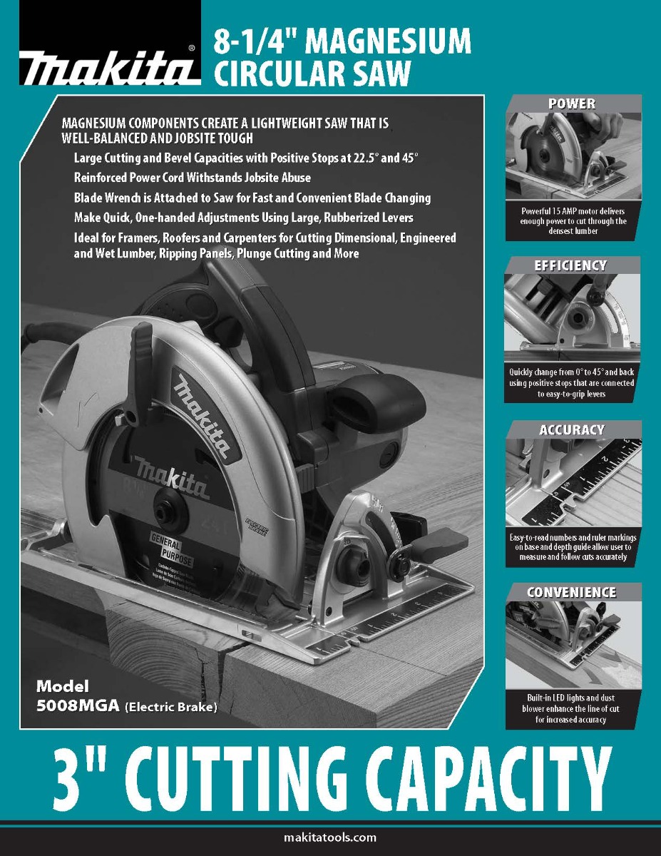The Makita 8-1/4” Magnesium Circular Saw  features highly durable magnesium components and a powerful 15 AMP Makita-built industrial motor, powerful enough to cut through the densest lumber. The 5008MGA balances weight, power, durability, and ease of use with a 3” maximum cutting capacity, making it perfect for framers, roofers, as well as general contractors who require a best-in-class engineered circular saw.