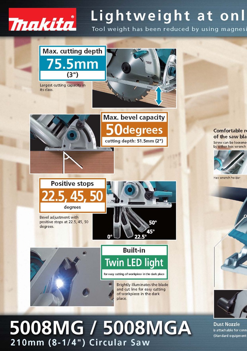 The 5008MGA 8-1/4” Circular Saw is built for framing walls, floors and roofs using a range of dimensional lumber and dense engineered lumber, including LVL, Parallam and I-Joists, headers and microlams; as well as ripping panels such as plywood, OSB, particle board, and dense structural panels like Advantech. Other applications include plunge cutting, pocket cutting, bevel cutting, masonry and metal cutting.