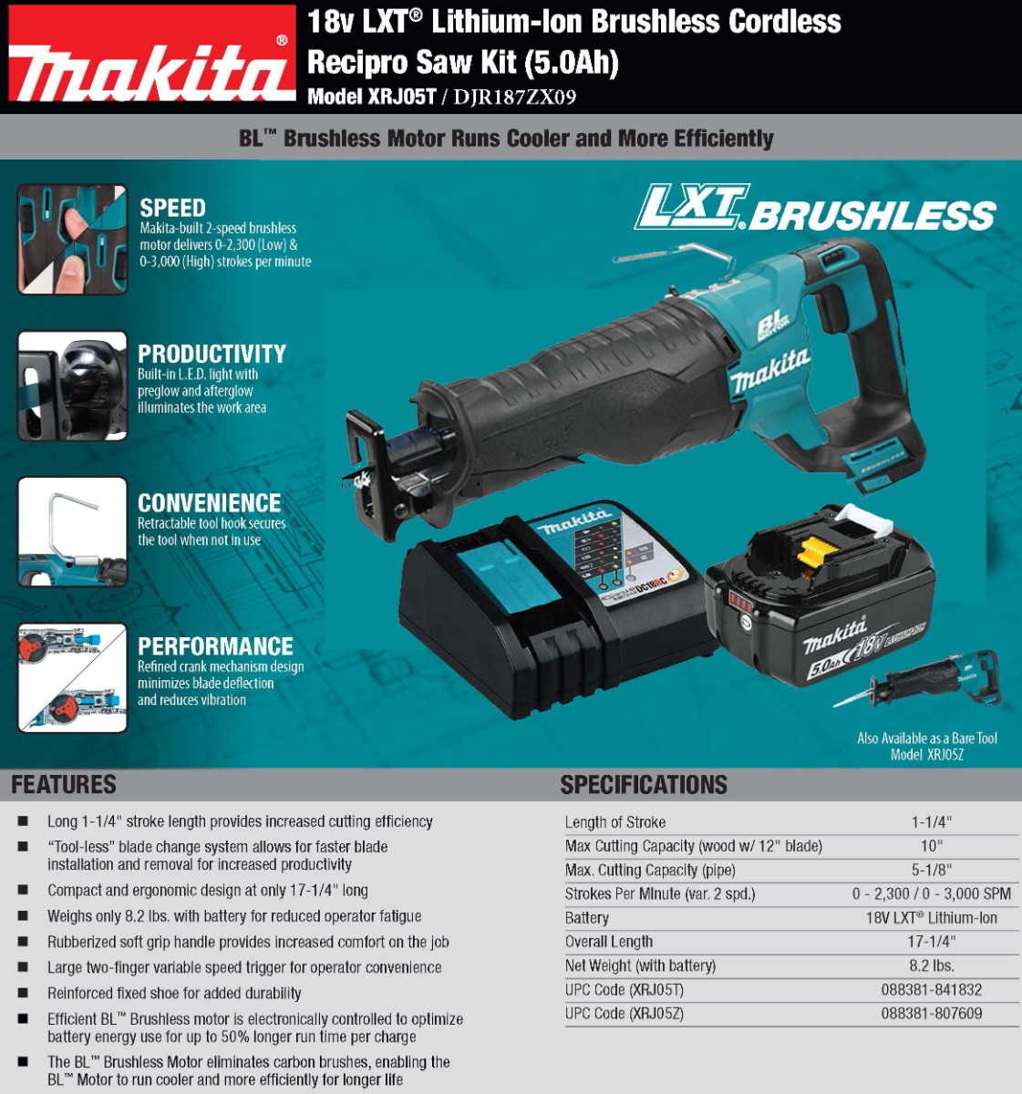 Makita, a pioneer in brushless motor technology and battery innovation, combines both in the 18V LXT® Lithium-Ion Brushless Recipro Saw Kit. It has an electronically-controlled BL™ Brushless motor that matches torque and RPM to the application, and is powered by the industry’s fastest charging 18V lithium-ion batteries. With Makita, users can remain in one battery platform, using the same fast-charging 18V batteries on the DJR187RTE/XRJ05T as they use across the Makita 18V LXT® cordless tool line-up.