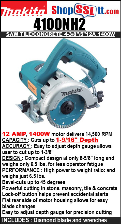 The Makita 4-3/8" / 5" Masonry Saw (Model 4100NH2) is a powerful cutting solution that is ideal for a range of applications including stone, tile, and concrete. The 5" Masonry Saw is powered by a 12 AMP motor, with 12,200 RPM. Convenience features include a lock-off button, and a flat rear side motor housing that allows for easy blade changes. The saw weighs only 6.6 lbs. for improved operator comfort.