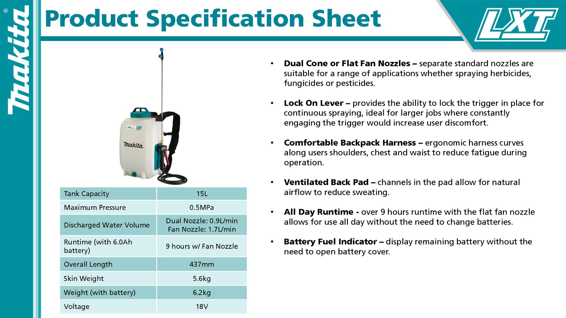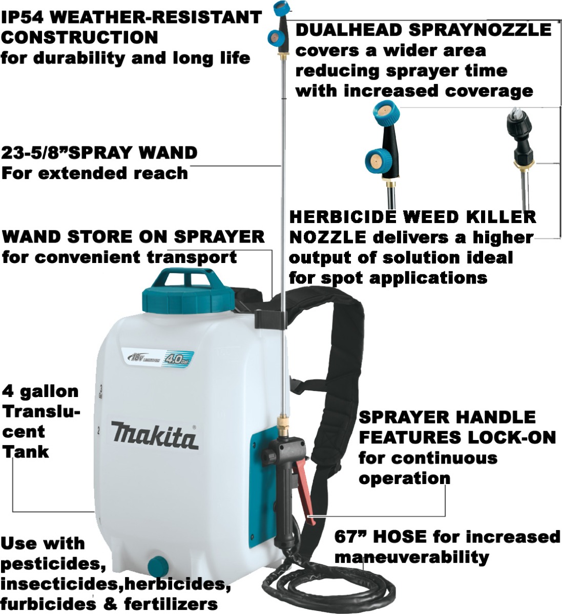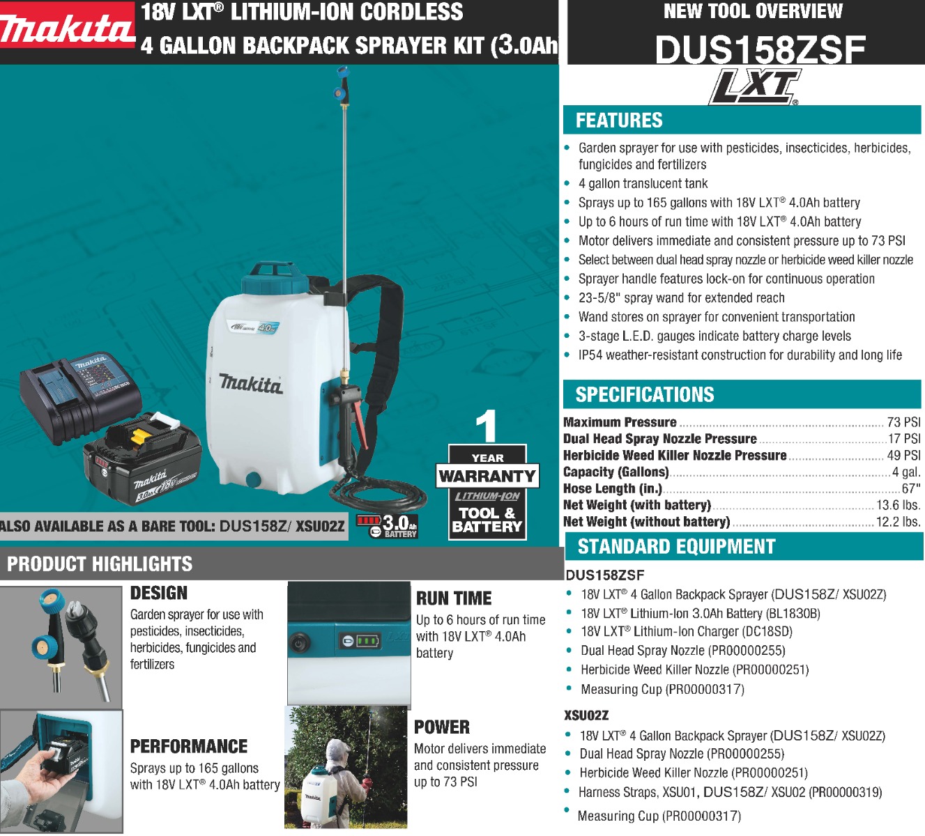 The 18V LXT® 4 Gallon Backpack Sprayer Kit (DUS158ZSF) is a garden sprayer for use with pesticides, insecticides, herbicides, fungicides and fertilizers. The 4 Gallon Backpack Sprayer can spray up to 165 gallons with one 18V LXT® 4.0Ah Battery. It can deliver up to 4.5 hours of run time with 18V LXT® 43.0Ah battery.