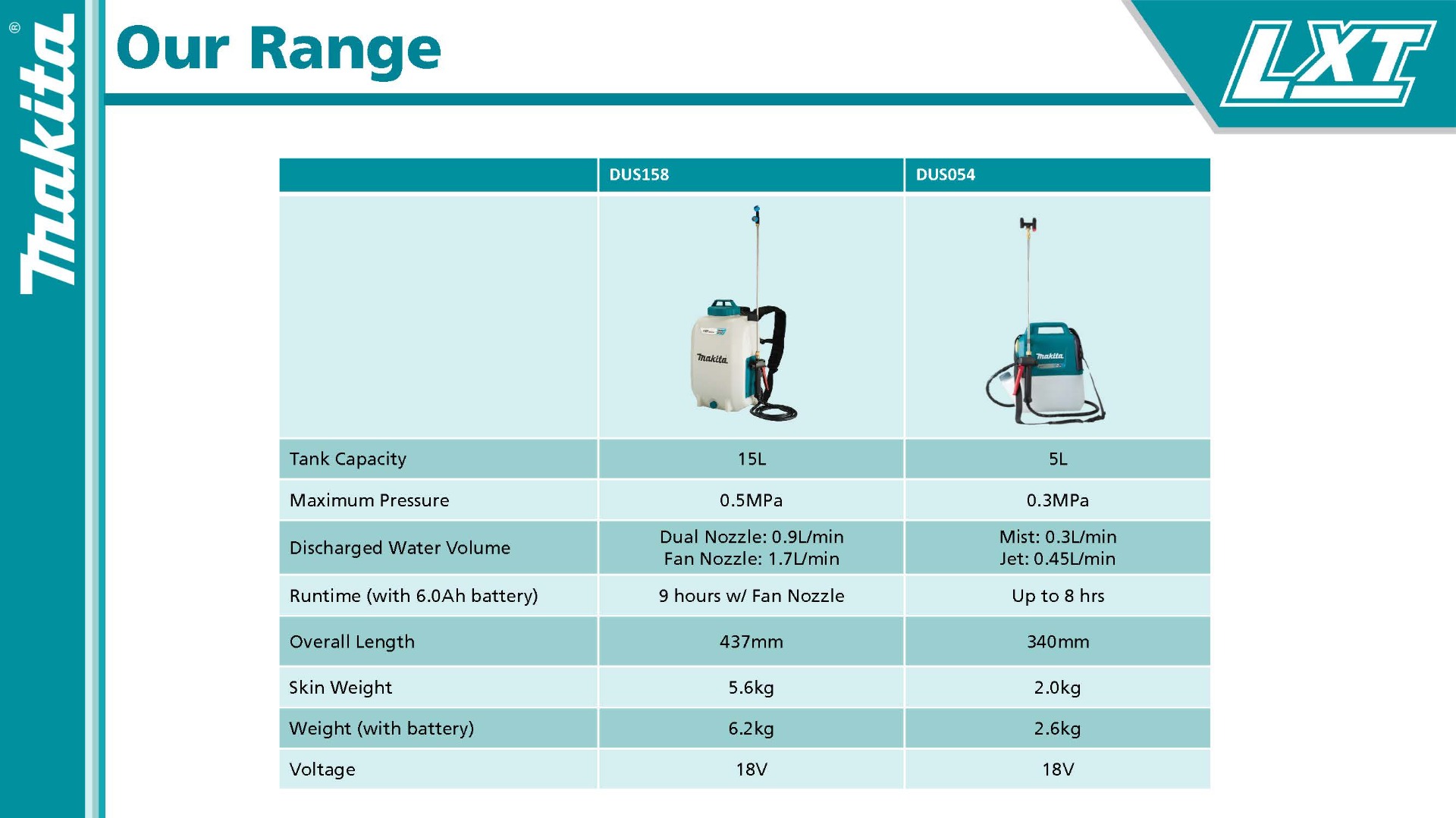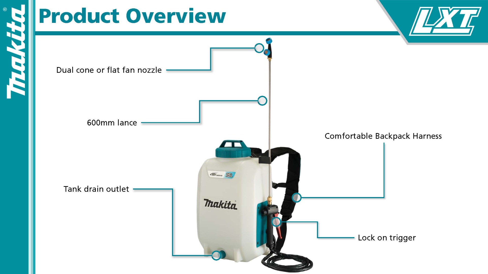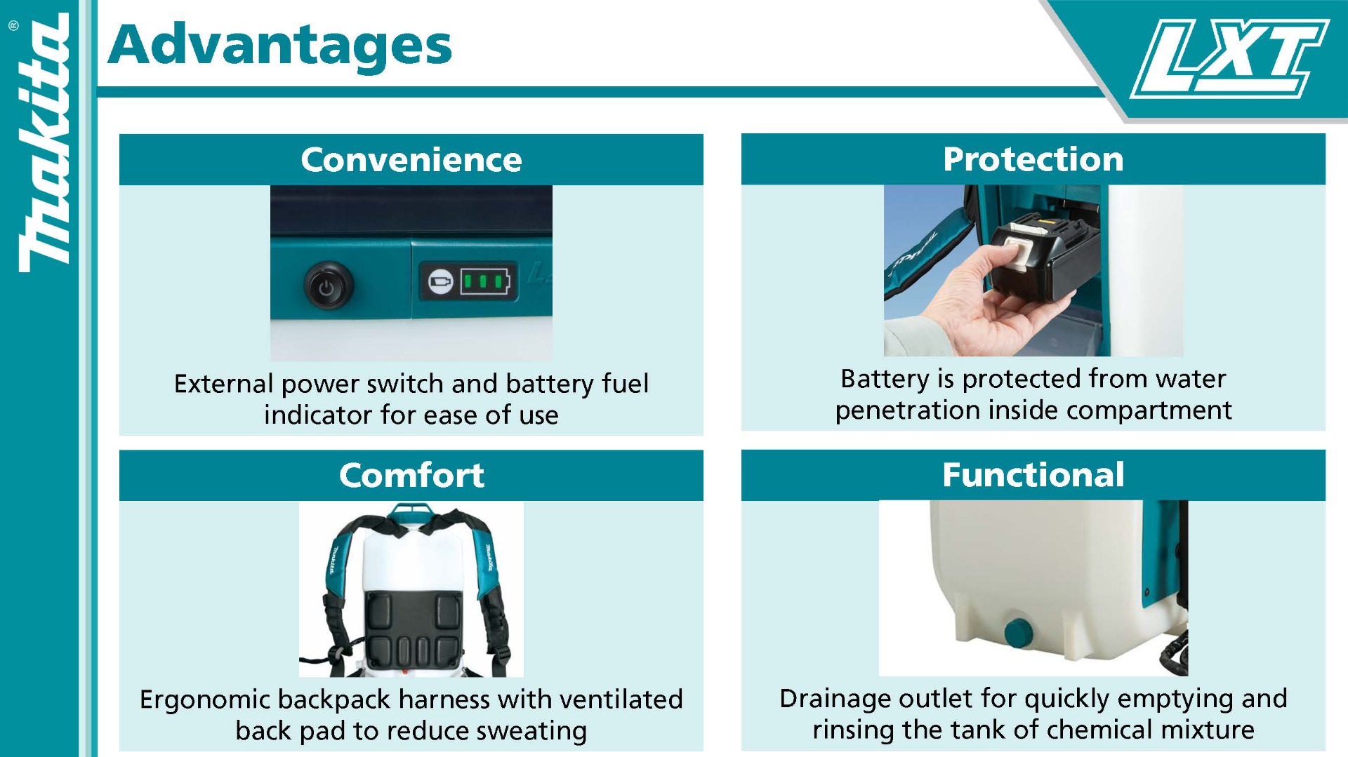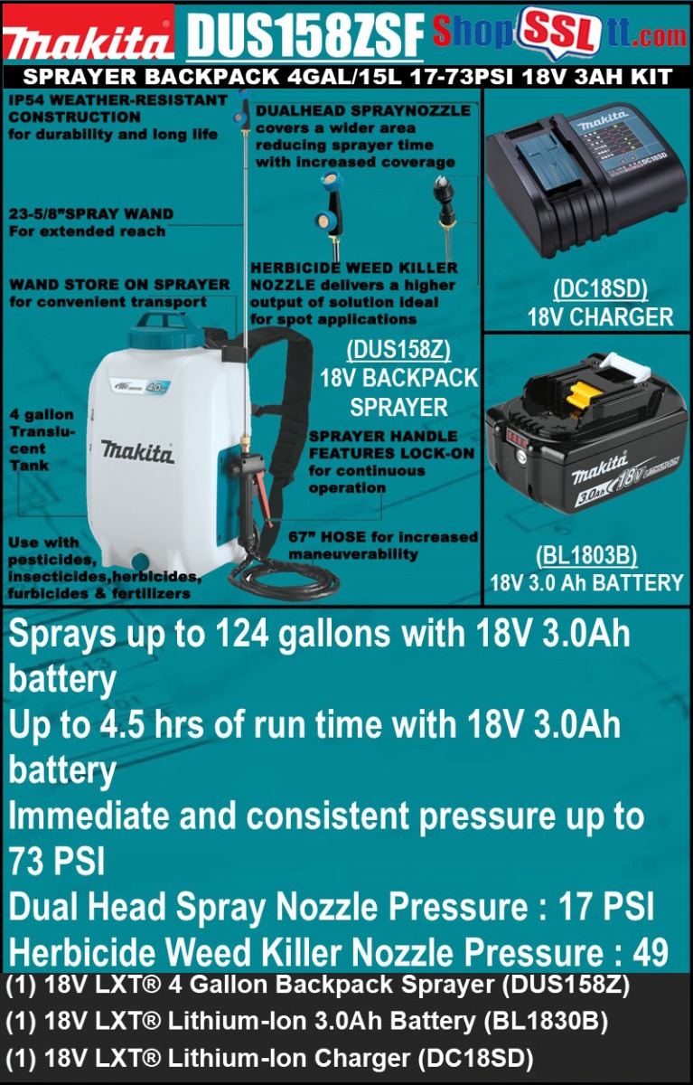 The 18V LXT® 4 Gallon Backpack Sprayer Kit (DUS158ZSF) is a garden sprayer for use with pesticides, insecticides, herbicides, fungicides and fertilizers. The 4 Gallon Backpack Sprayer can spray up to 165 gallons with one 18V LXT® 4.0Ah Battery. It can deliver up to 4.5 hours of run time with 18V LXT® 43.0Ah battery.