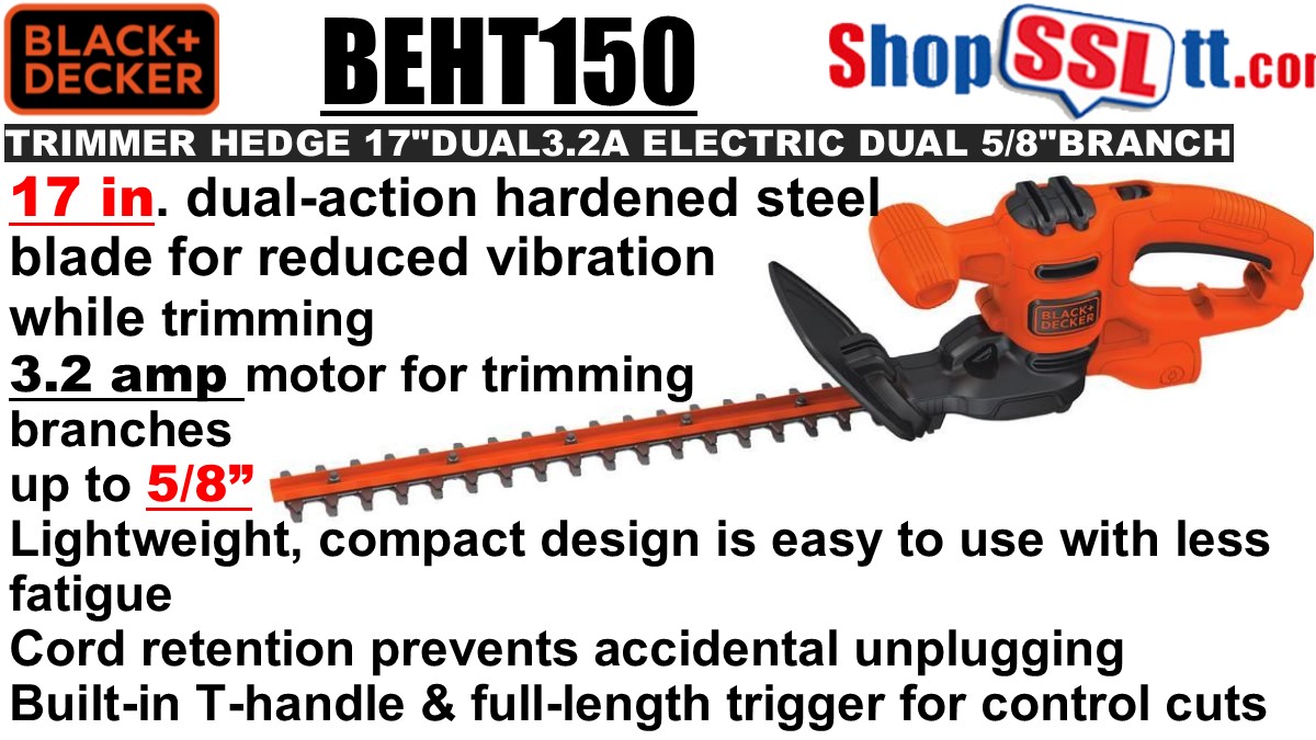 Our 17-inch electric edge trimmer is compact, so BLACK+DECKER® hedge trimmer ideal for small hedges, shrubs, and bushes. With its lightweight design, built-in T-handle, and full-length trigger, the bush trimmer is made for less fatigue and more control while cutting.