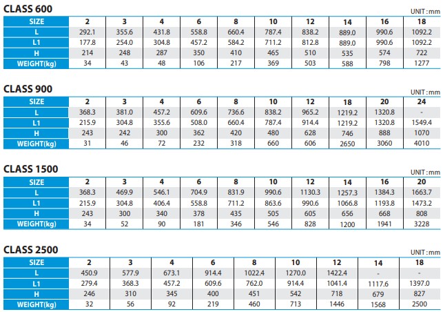 For butt-welded ends (B.W), of which the end to end dimension conforms to ASME B16.10, customer must specify the schedule type required, pipe class, or bore diameter. Ring joint flanged ends (R.T.J) conform to ASME B16.5 and the end to end dimension follows ASME B16.10. The other special end connections may be supplied as required by customer.