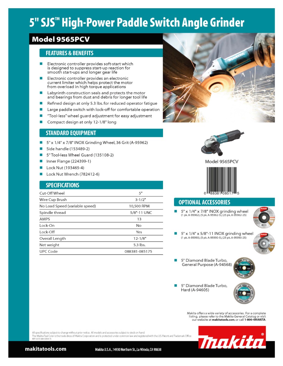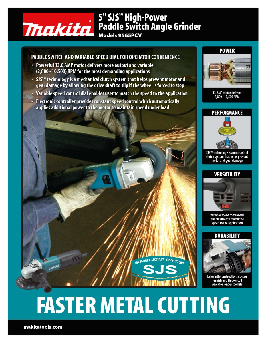 Makita’s 5” SJS™ Angle Grinder combines 13 AMP power and variable speed with comfort and motor-protection features for longer-lasting industrial performance. The 9565PCV is engineered with Makita’s innovative SJS™ mechanical clutch system to protect the gears for longer tool life.