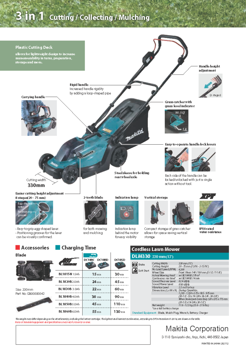 The DLM330 is a 330mm Lawn Mower powered by a single 18V LXT Li-Ion battery. Optimal for use in a home garden where the ability to turn in a small radius is required.
