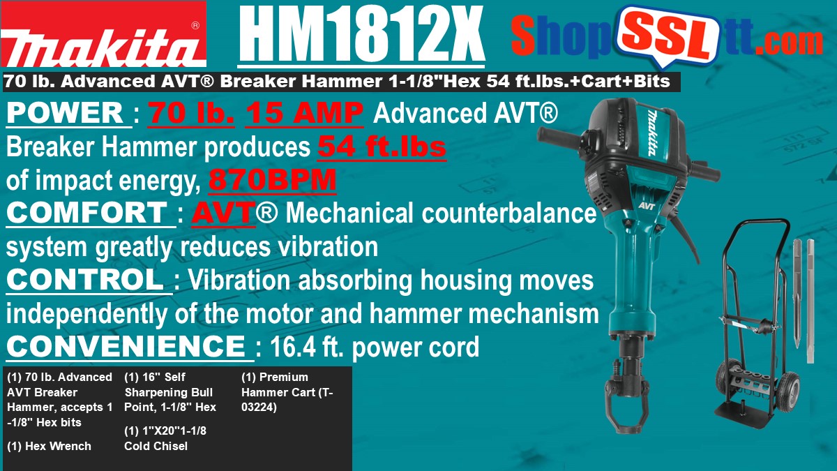 The new 70 lb. AVT Breaker Hammer is engineered to hit like an air hammer, but with less noise and vibration. It has a powerful 15 AMP motor that delivers a full 53.9 ft.lbs. (73.8 Joules) of impact energy, so contractors get hard-hitting performance. Users also benefit from less noise and lower vibration than an air hammer, and zero hassle with an air hose and compressor. The HM1812 features the latest Advanced AVT Technology, a synchronized three-component system that more effectively reduces vibration. The internal mechanical counterbalance system, vibration-absorbing housing, and fixed movement handles are engineered for significantly less vibration during concrete breaking applications. Model HM1812X3 is a kit and also includes a Premium Hammer Cart, as well as two 1-1/8" x 20-1/2" Flat Chisels (1-1/8" Hex) and two 16" Self-Sharpening Bull Point bits (1-1/8" Hex).