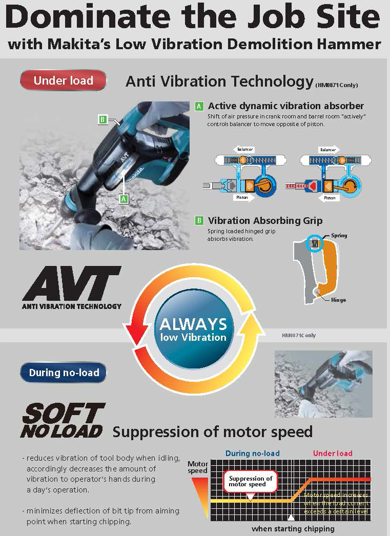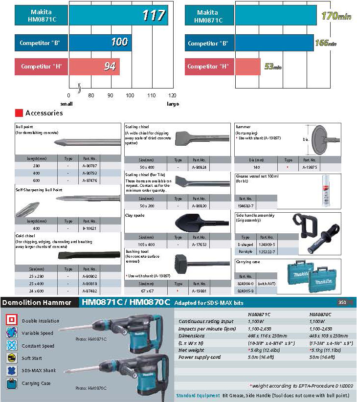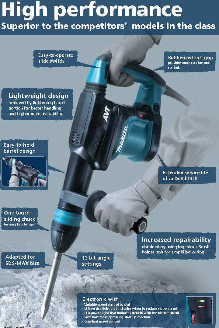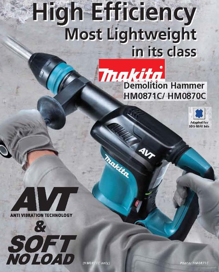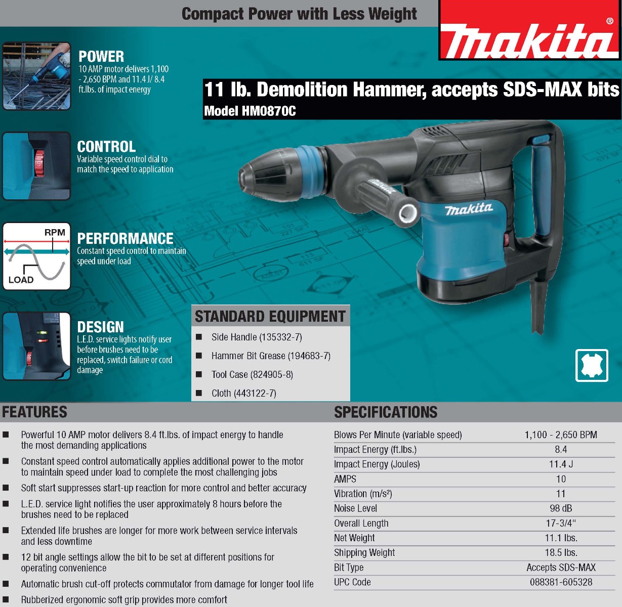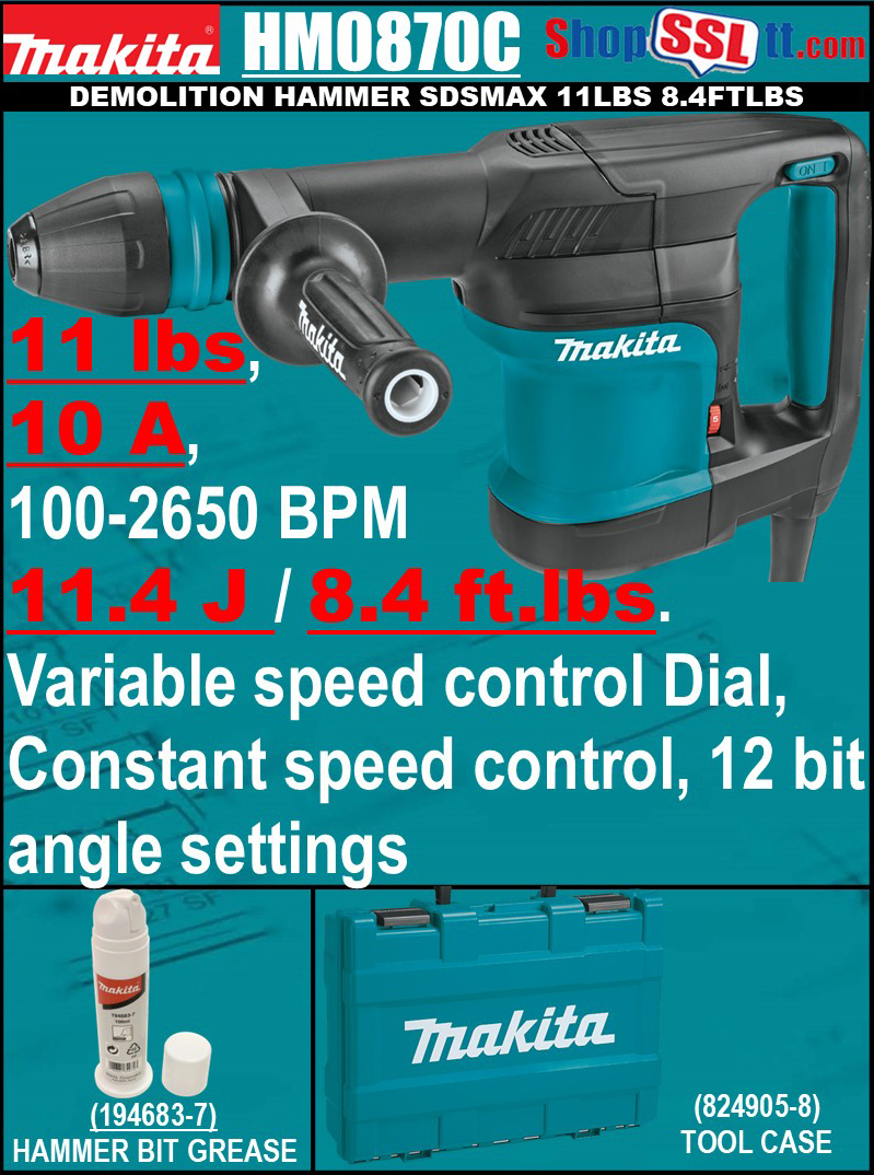 The Makita 11 lb. Demolition Hammer has more power with 8.4 ft.lb. of impact energy, yet weighs only 11.1 lbs. The HM0870C (accepts SDS-MAX bits) has constant speed control that automatically applies additional power to the motor to maintain speed under load. The 12 bit angle settings allows the bit to be set a different positions for operator comfort. The Makita HM0870C Demolition Hammer is ideal for horizontal work.