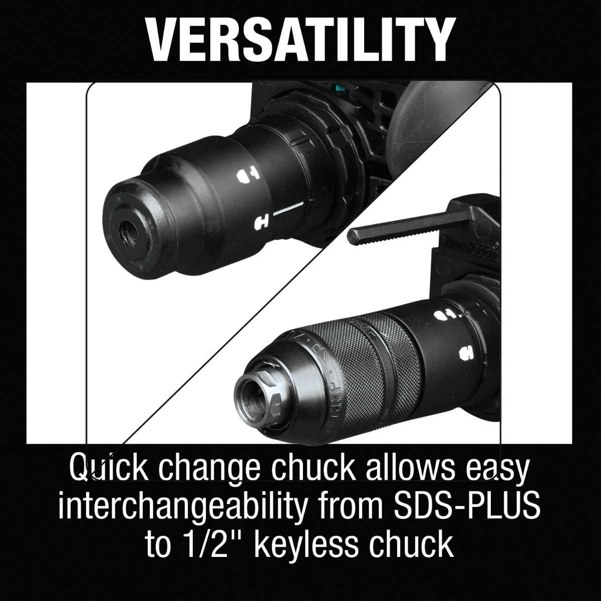 CONVENIENCE : Quick change chuck allows for interchangeability from SDS-PLUS to 1/2" keyless chuck