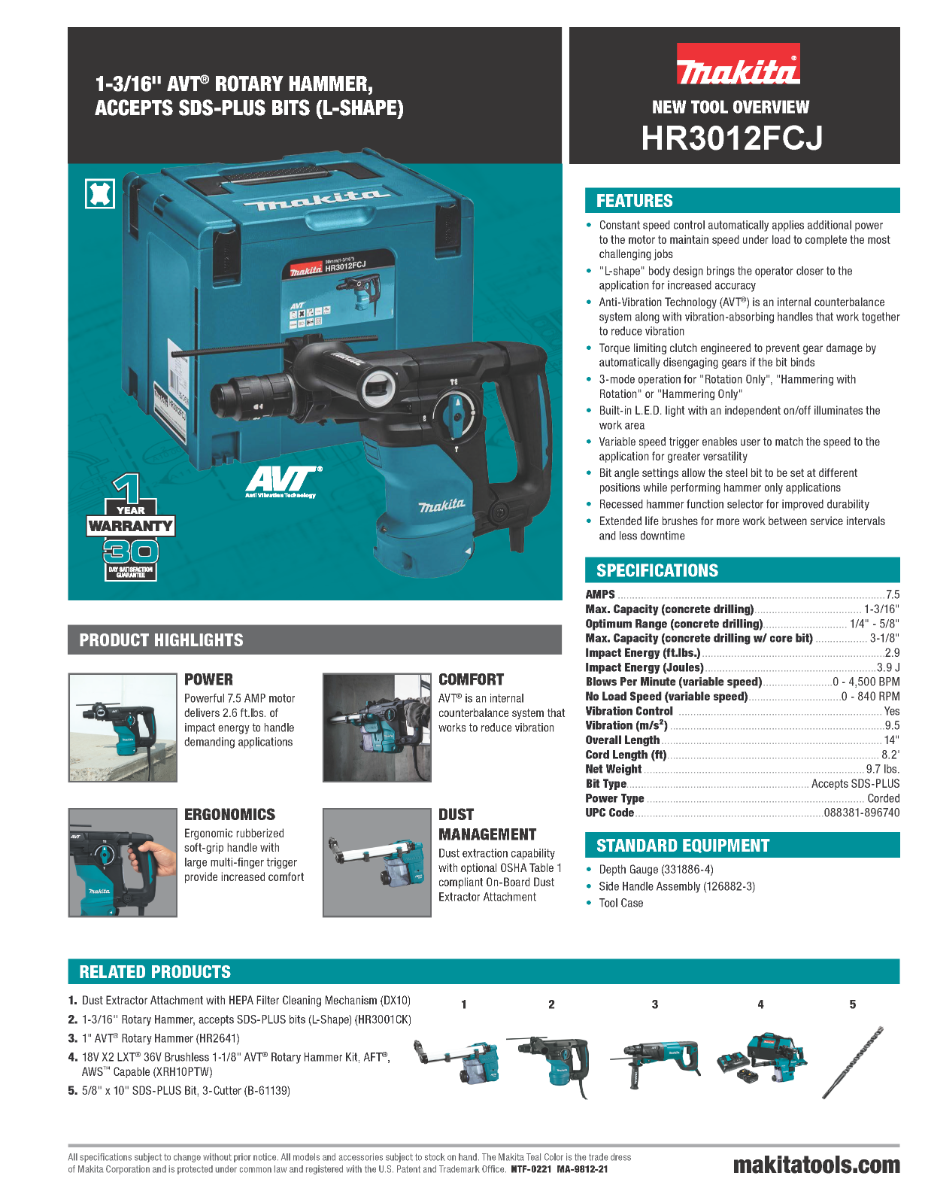 The 1-3/16” AVT® Rotary Hammer (HR3012FCJ) is engineered is engineered with Anti-Vibration Technology (AVT®), an internal counterbalance system for significantly less vibration. The HR3012FCJ combines performance and power with less vibration and is ideal for a range of applications.The quick-change chuck allows the user to switch from SDS-PLUS bits to ½” keyless chuck to utilize straight shank bits.