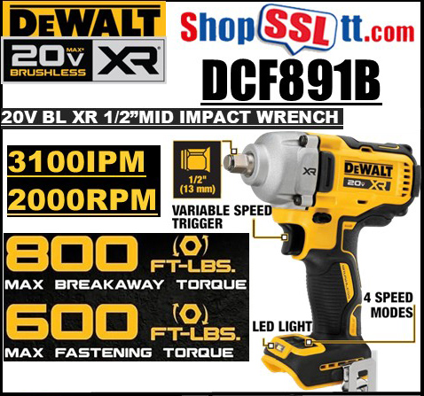 WRENCH IMPACT 1/2" 800# XR BL 20V TOOL ONLY